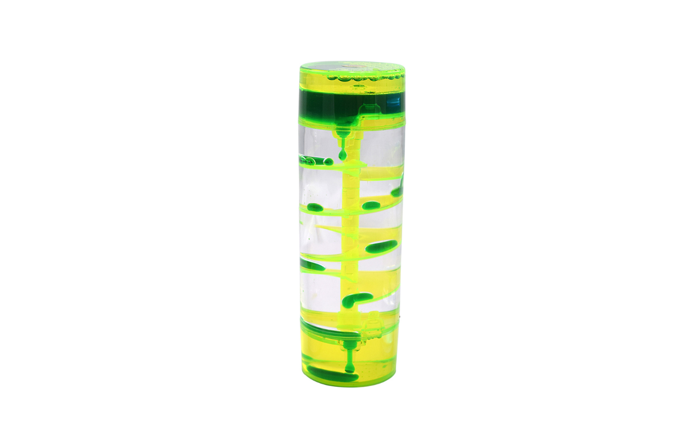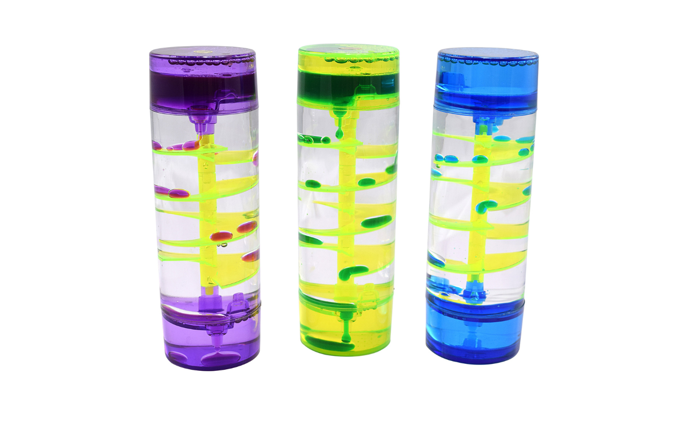 Kristalheldere sensorische vloeistofset met kleurrijke olie en water. Wanneer ze ondersteboven worden gedraaid, rolt de gekleurde vloeistof in een spiraal naar de onderkant van de zandloper.