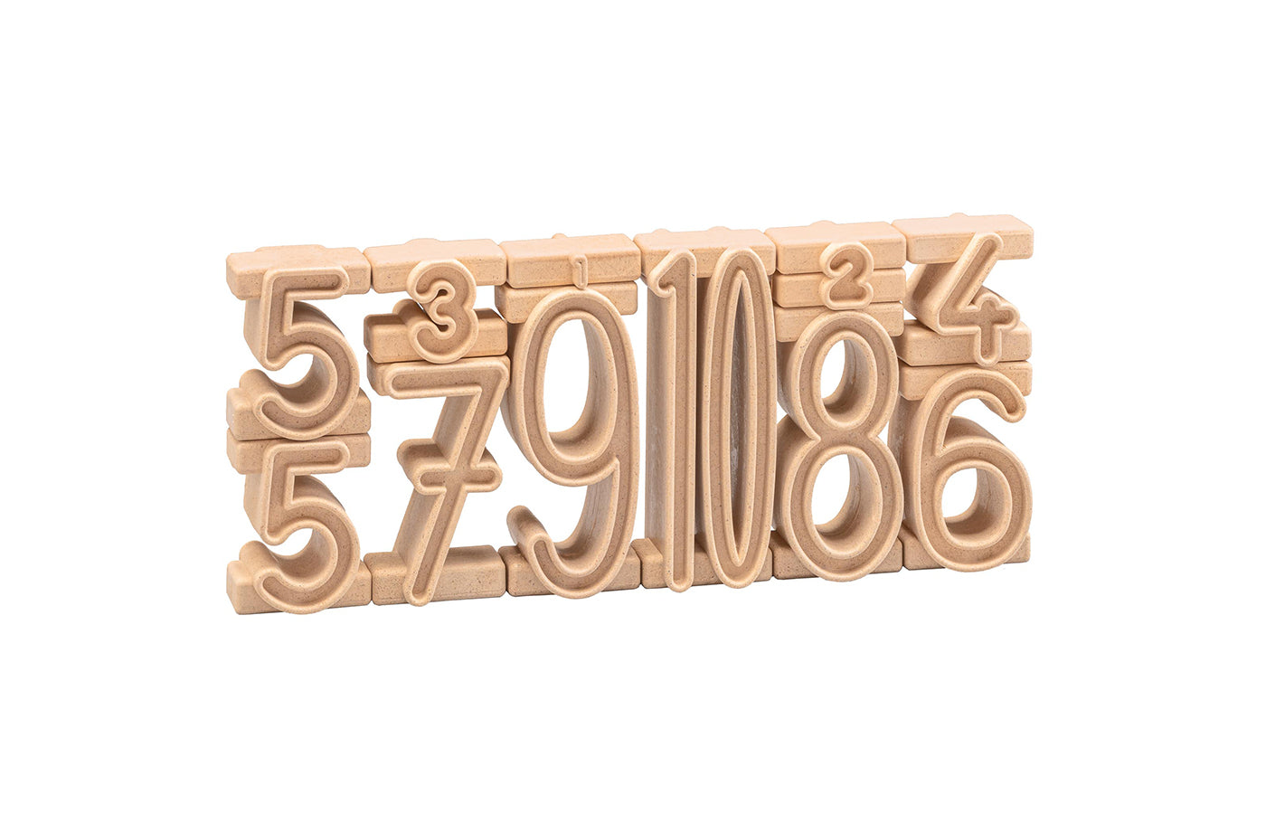 Set van 11 kleurloze stapelcijfers gemaakt van Re-Wood. Handig hulpmiddel bij het rekenen. Dit kan ingezet worden om de sommen te automatiseren of het splitsen verder in te oefenen. Het is mogelijk om op 10 verschillende manieren de waarde 10 te vormen. De waarde van de stapelcijfers komt overeen met de hoogte in centimeter. Dus het cijfer 3 is 3 cm hoog en het cijfer 10 is 10 cm hoog. Alle cijfers zijn 4 cm breed en 3 cm dik.
