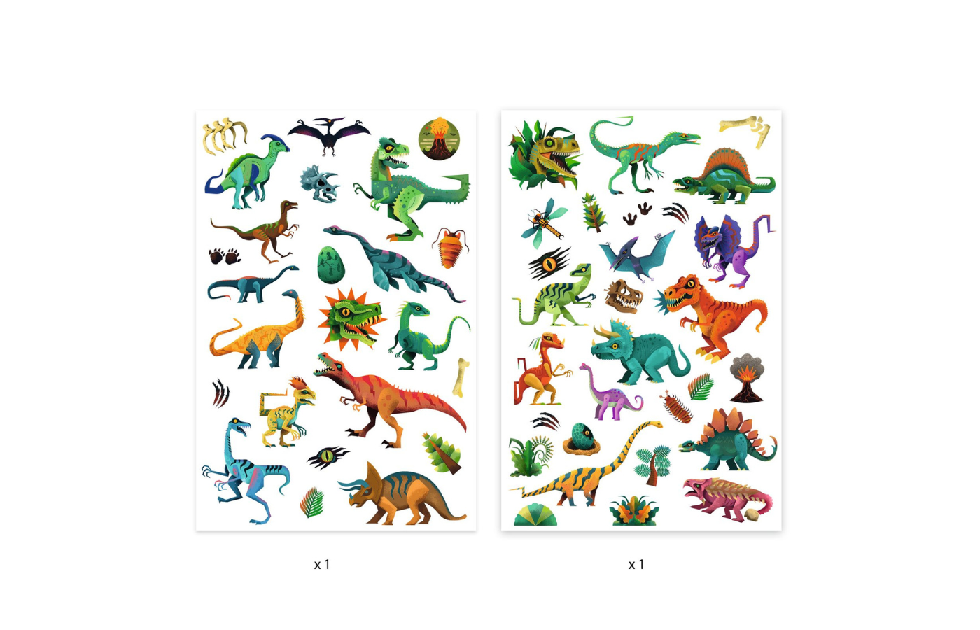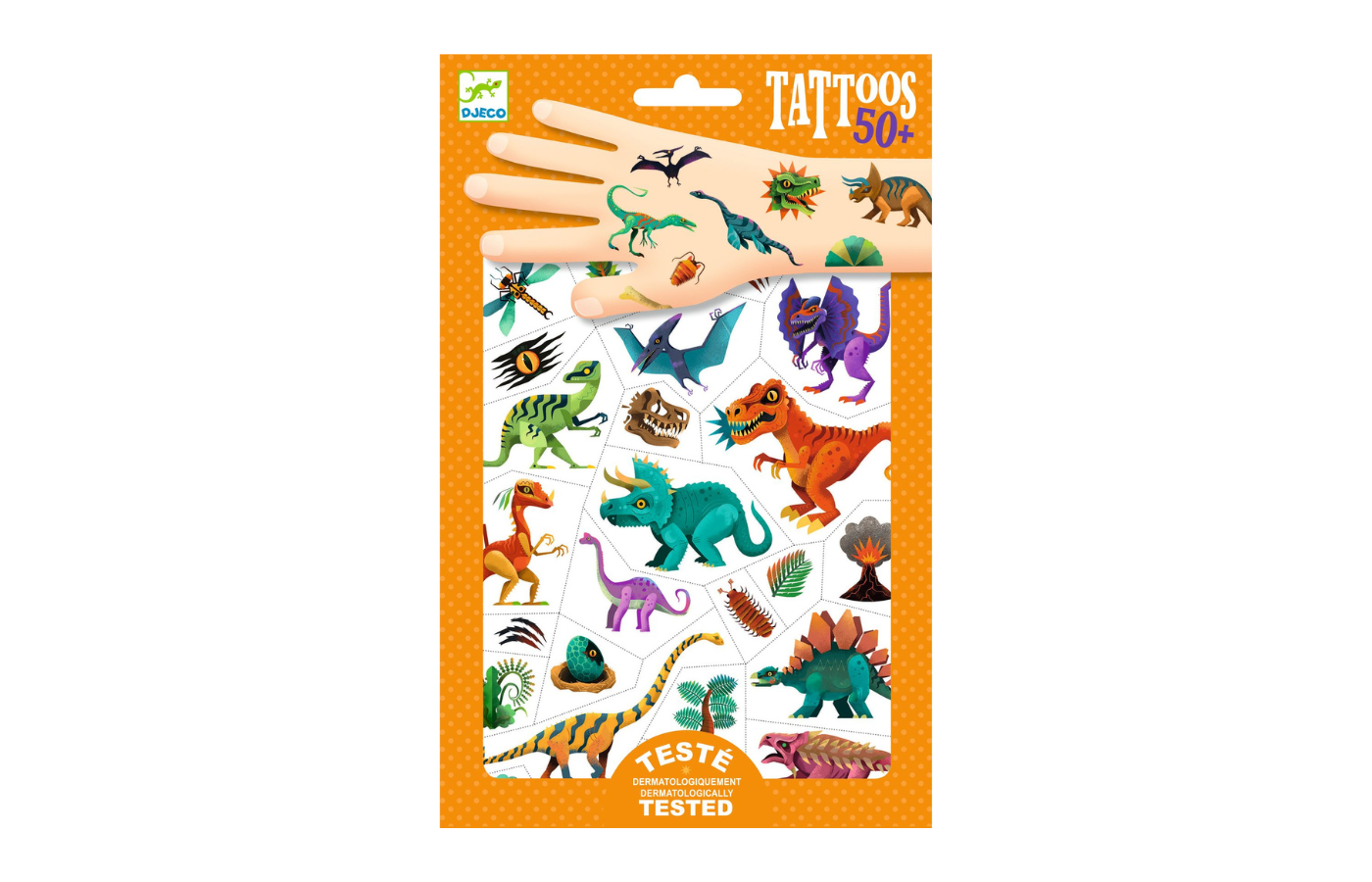 Twee stickervellen met tattoos om de huid mee te versieren. Knip de dinosaurus van je voorkeur uit en breng hem aan op je huid. De tattoos zijn dermatologisch getest.