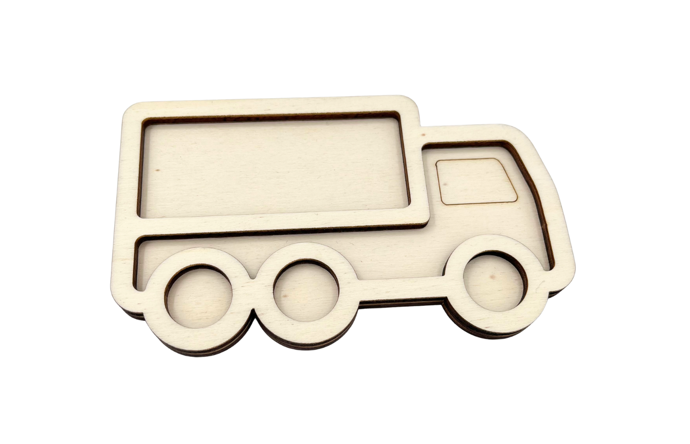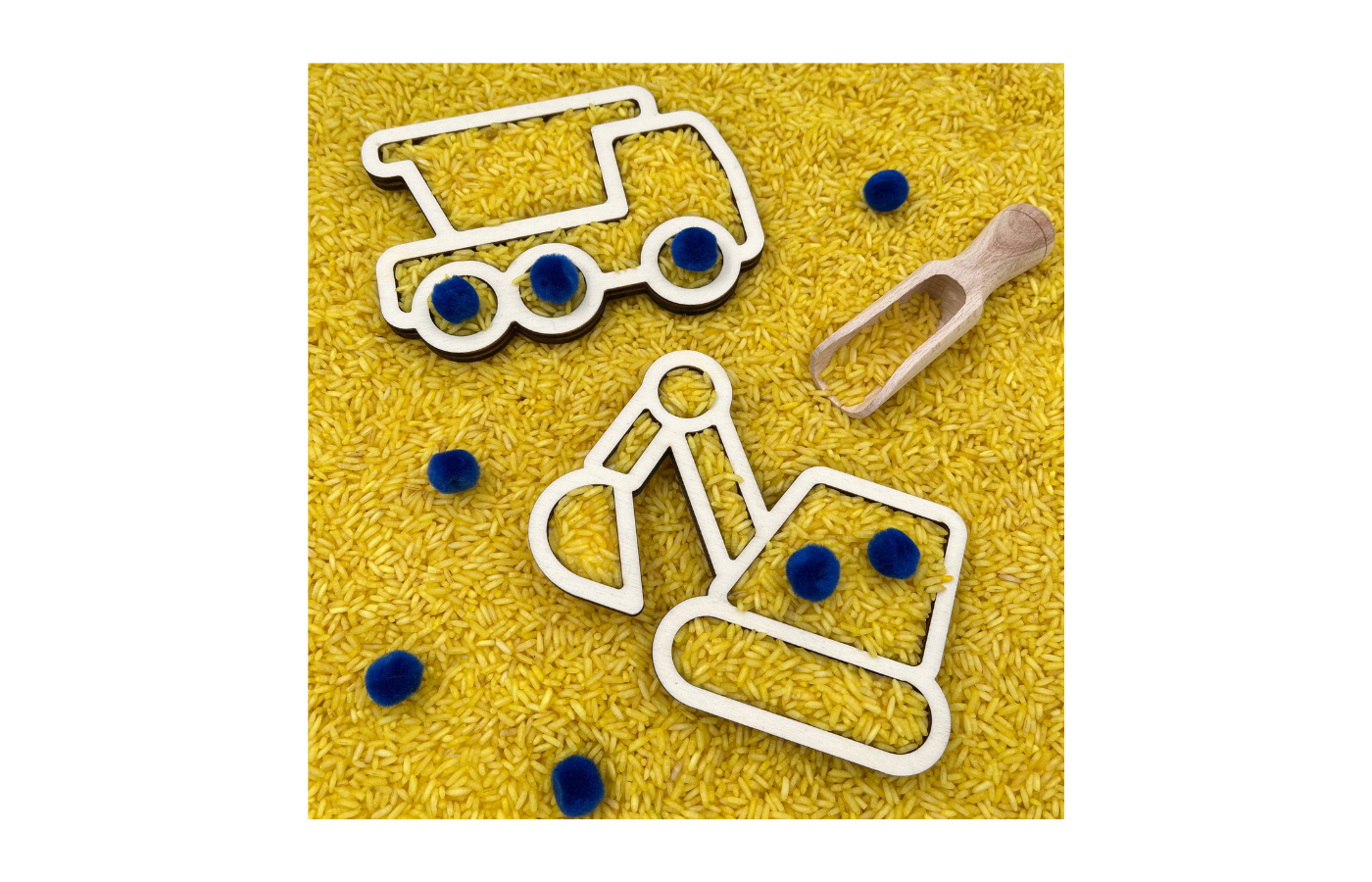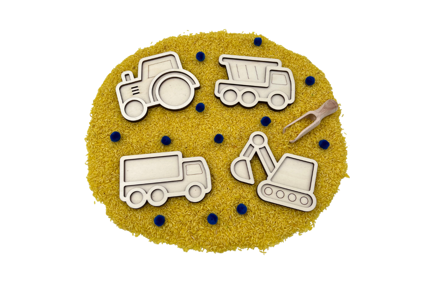 Vulvormen of speeltrays in het thema voertuigen. Een kraan, vrachtwagen, bestelwagen en een tractor. Perfect te vullen met droge materialen zoals speelrijst, kikkererwten, fijn zand,... In een schattig formaat.