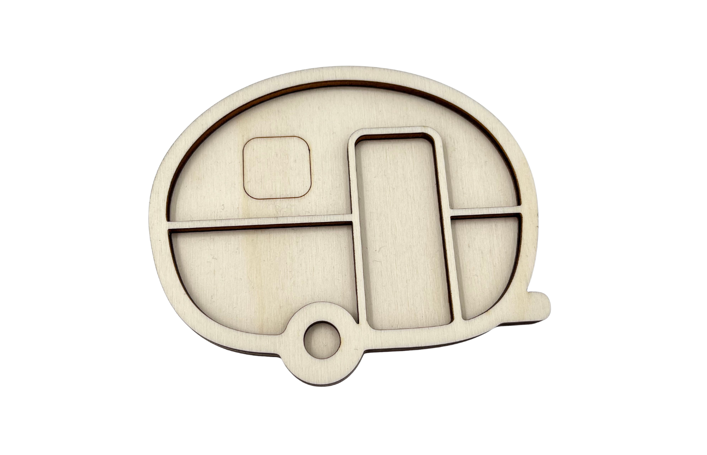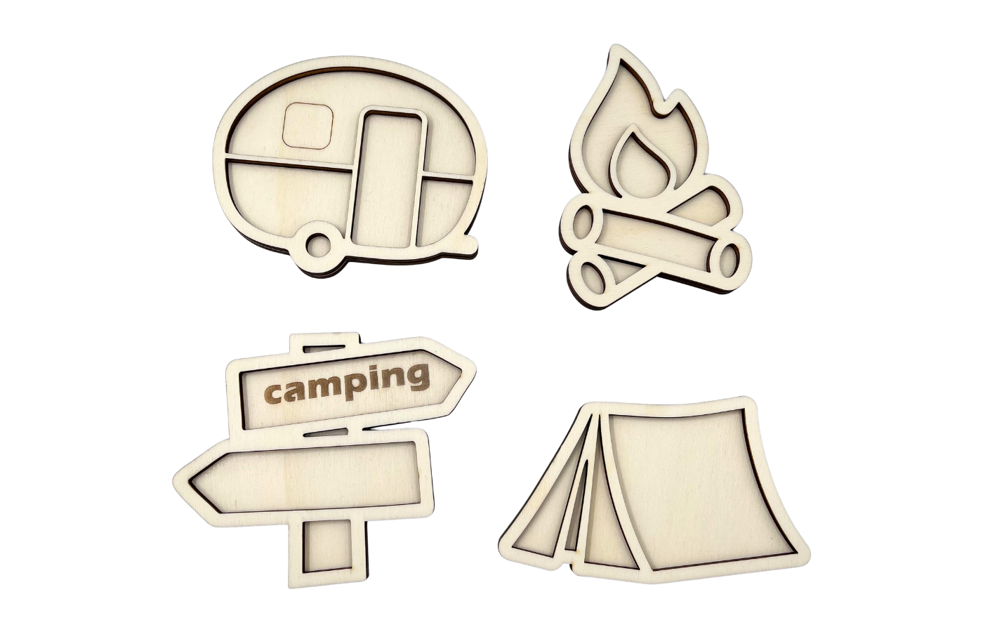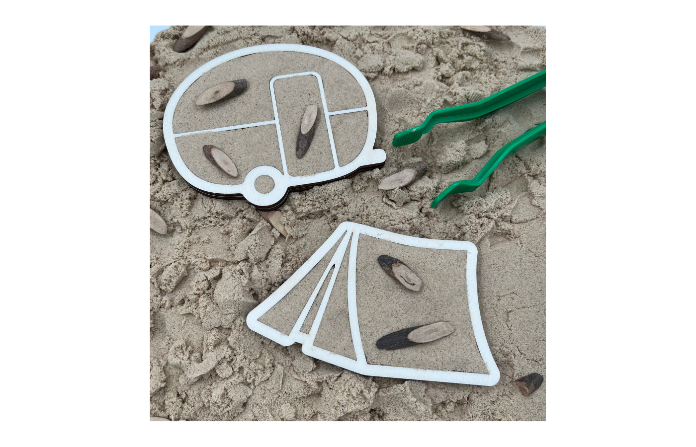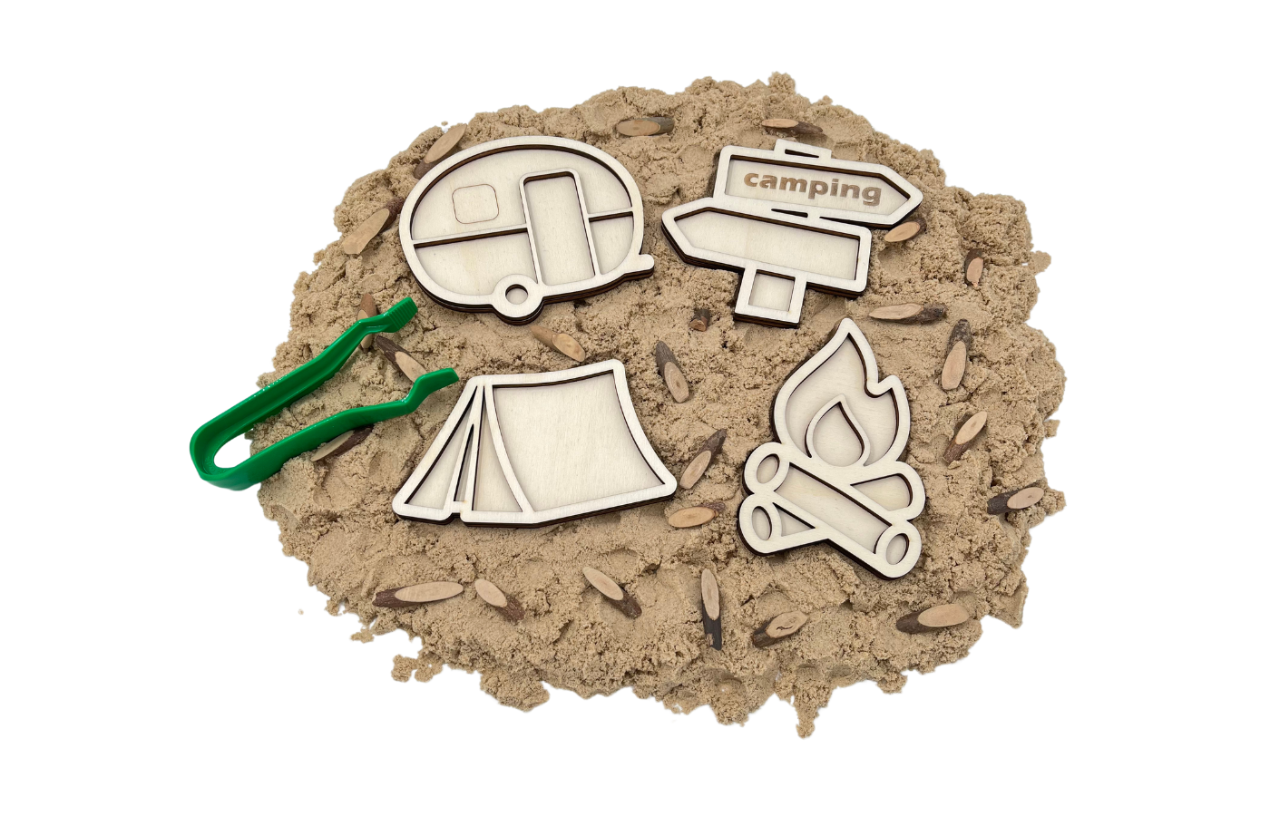 Vulvormen of speeltrays in thema zomer - kamperen. Vier verschillende figuren (kampvuur, caravan, richtingaanwijzer en een tent) in een leuk formaat. Perfect te vullen met droge materialen zoals speelrijst, kikkererwten, fijn zand,... .