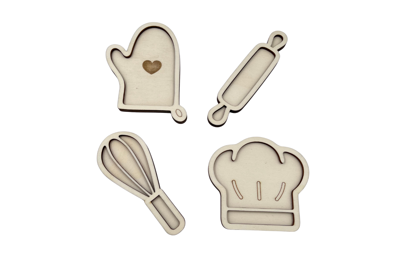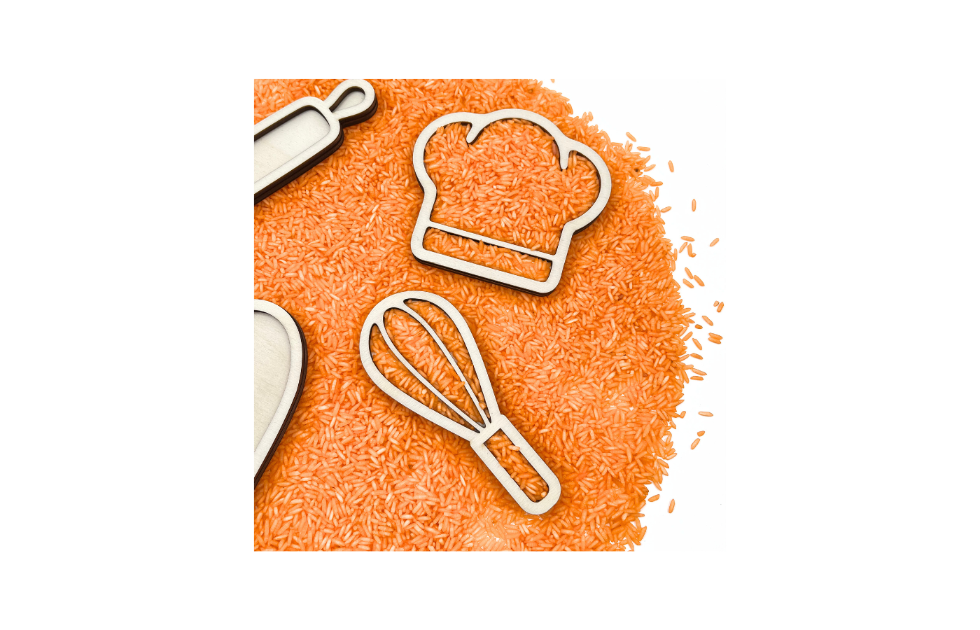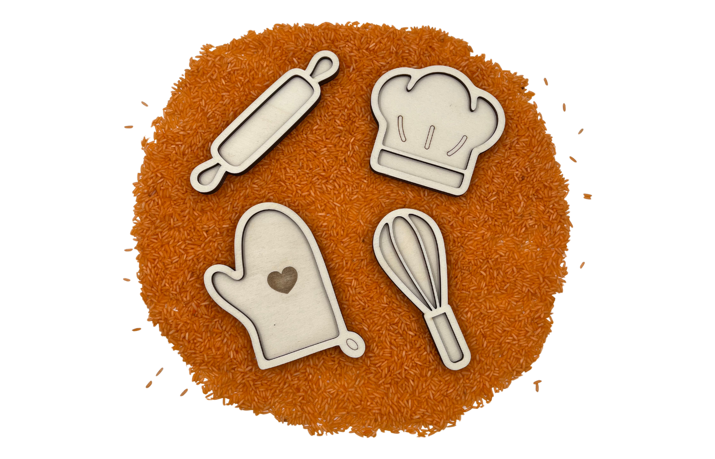 Vulvormen of speeltrays in thema de bakker. Vier verschillende figuren in het thema de bakker (ovenwant, deegrol, kokmuts en garde). Perfect te vullen met droge materialen zoals speelrijst, kikkererwten, fijn zand,... in een schattig formaat.