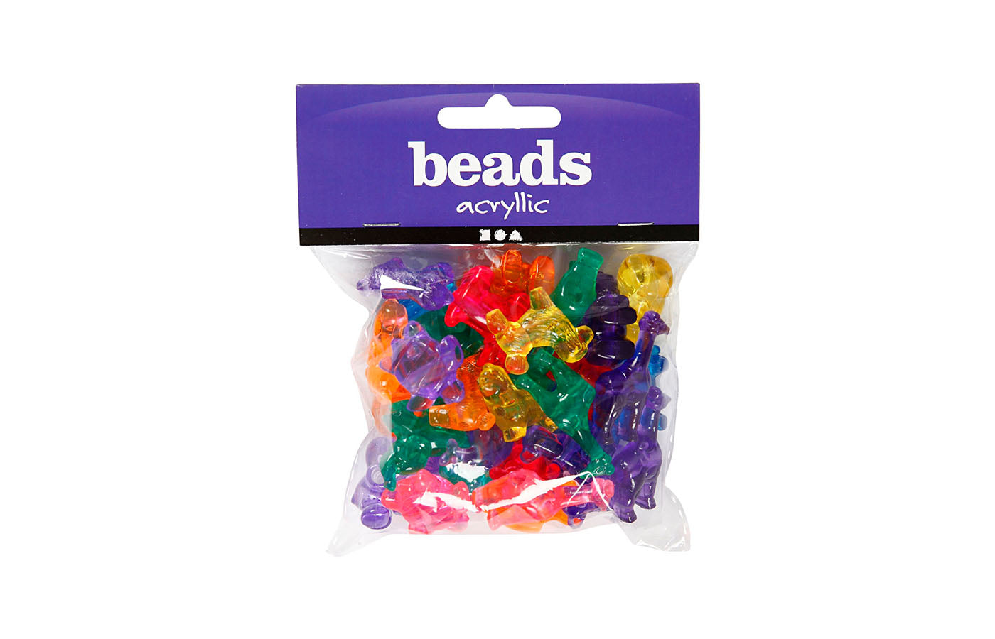 Transparante diervormige kralen in zes kleuren. Te gebruiken bij verschillende activiteiten zoals sorteren, tellen of patronen maken. Ook zeer geschikt om te gebruiken op de lichttafel of in de ontdekbak. Gatgrootte is 3 mm.