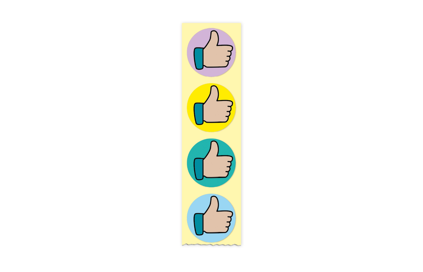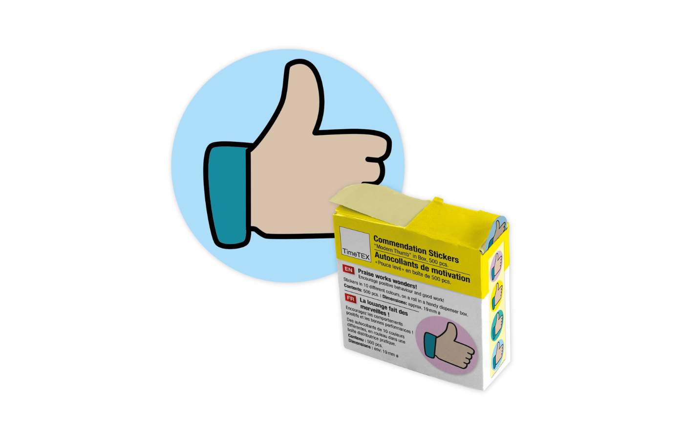 Deze box bevat 500 kleurrijke stickers met een duim om te gebruiken als beloningsstickers. De dispenser is uiterst praktisch, aangezien de stickers per stuk en snel uitgenomen kunnen worden. De rest van de stickers blijft netjes en tegen vuil of beschadiging opgeborgen in het doosje.