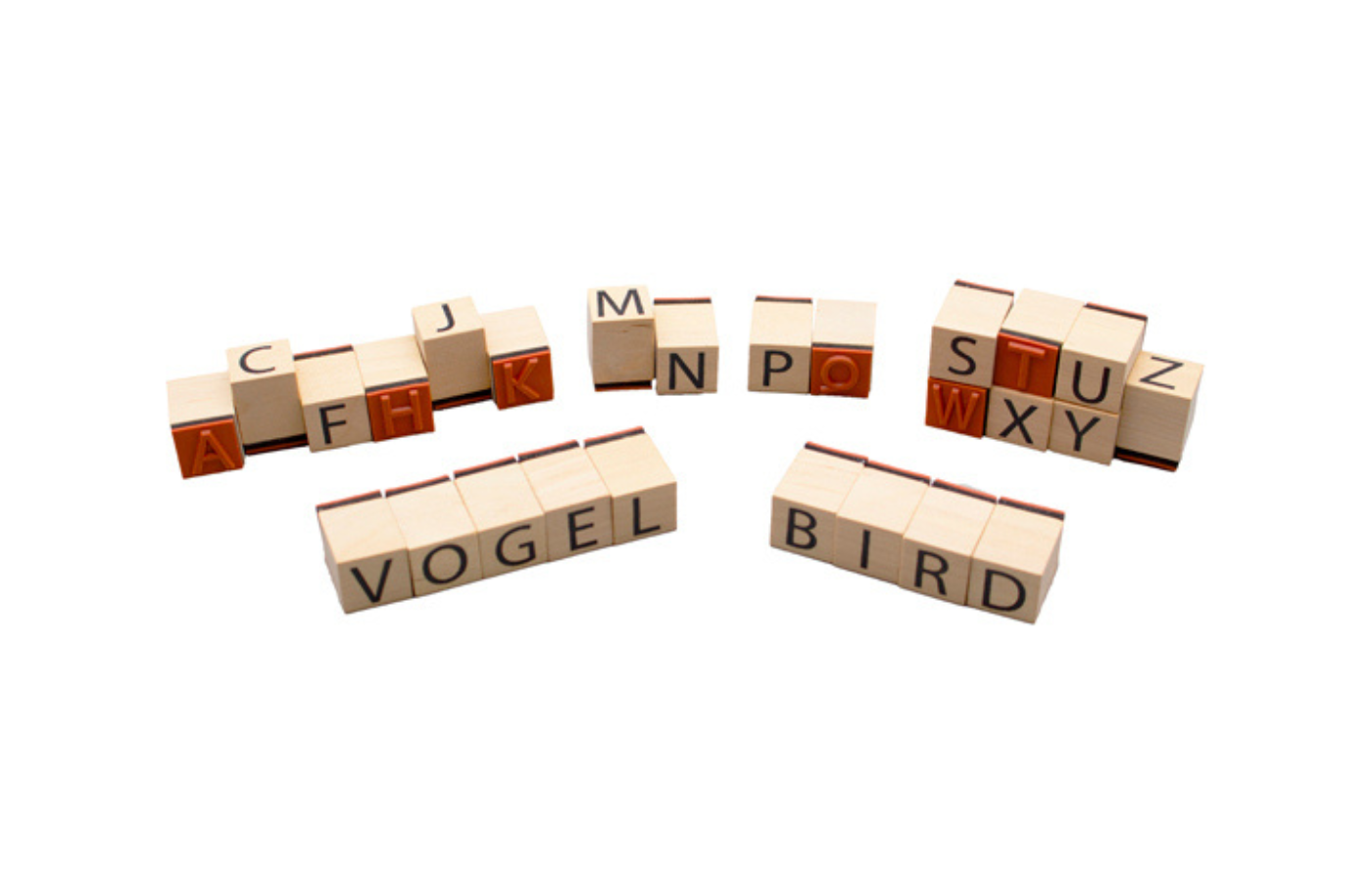 26 houten vierkanten letterstempels (afm. 3 x 2 x 2 cm)