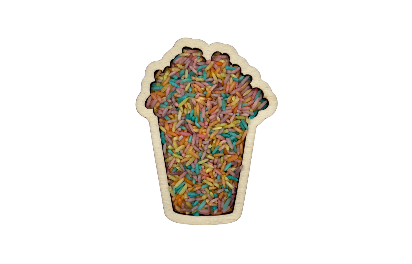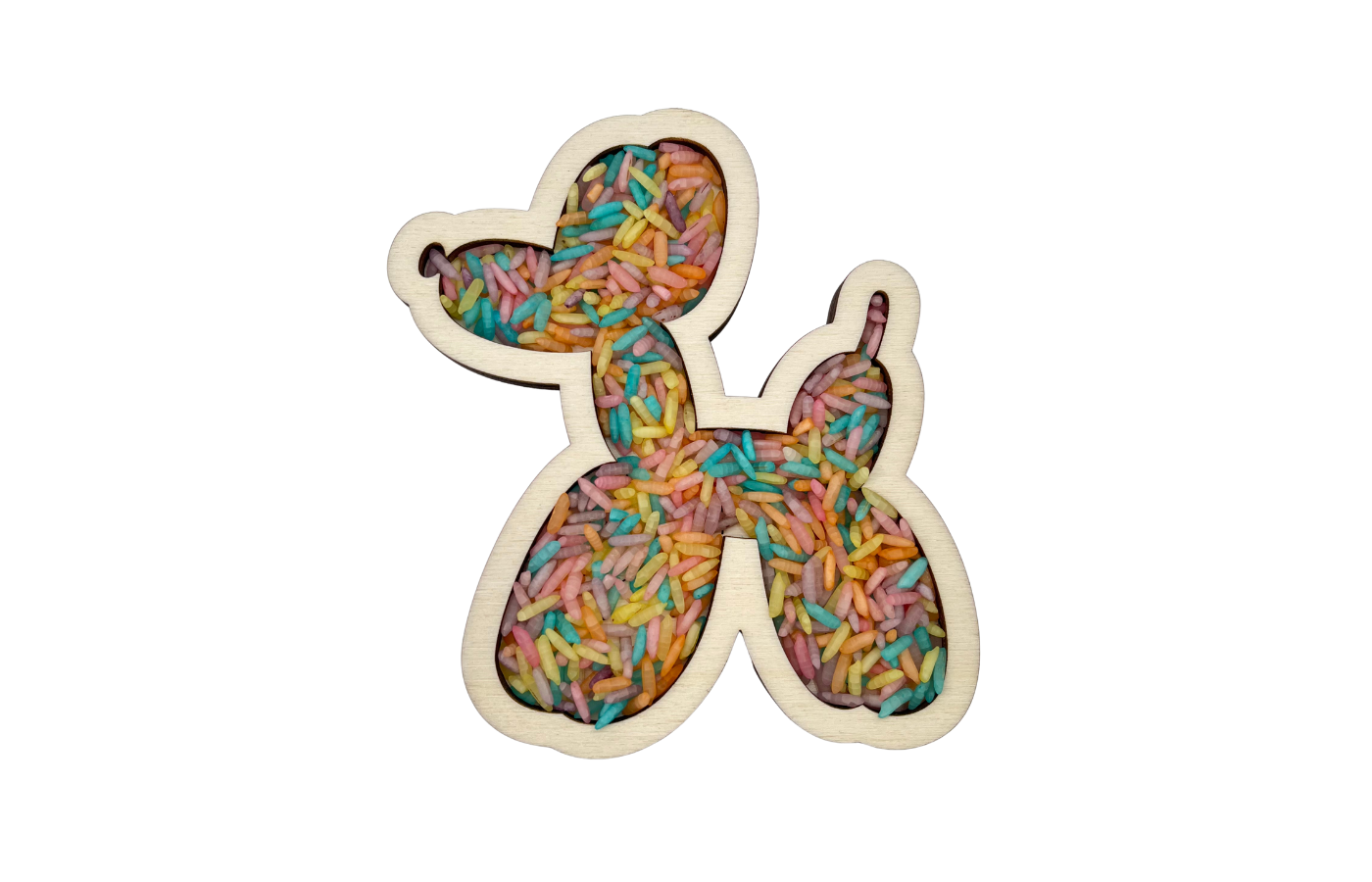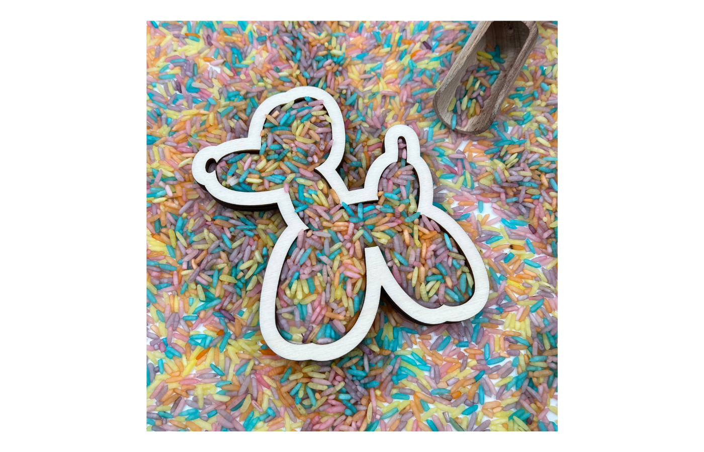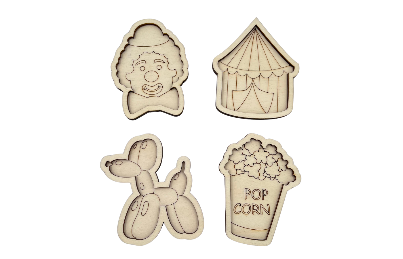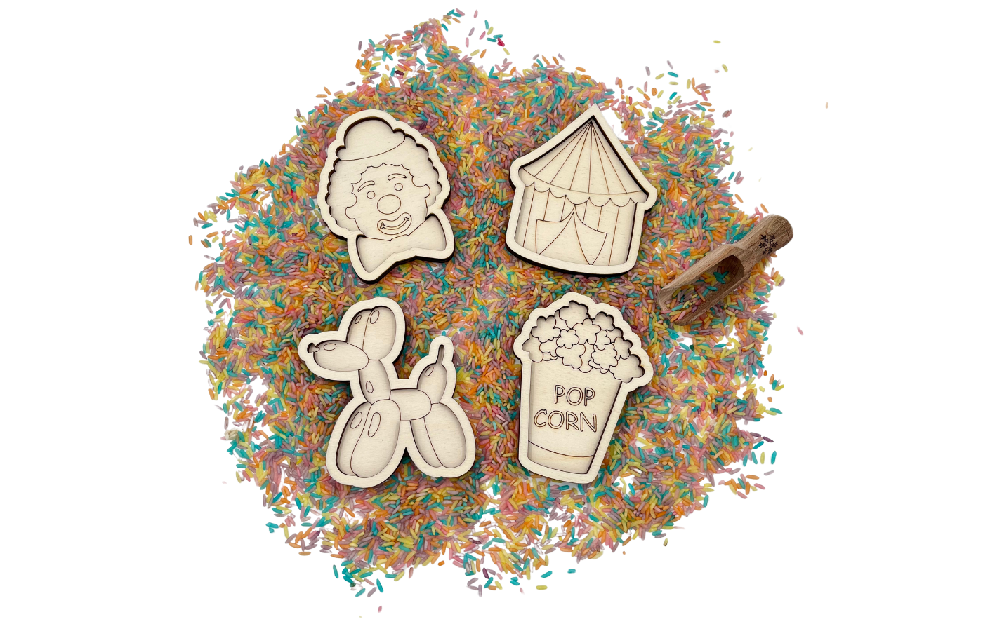 Vulvormen of speeltrays in thema circus. Vier verschillende figuren in het thema circus (popcorn, clown, tent en een ballonnenhond). Perfect te vullen met droge materialen zoals speelrijst, kikkererwten, fijn zand,... in een leuk formaat.