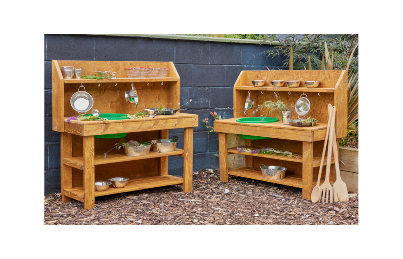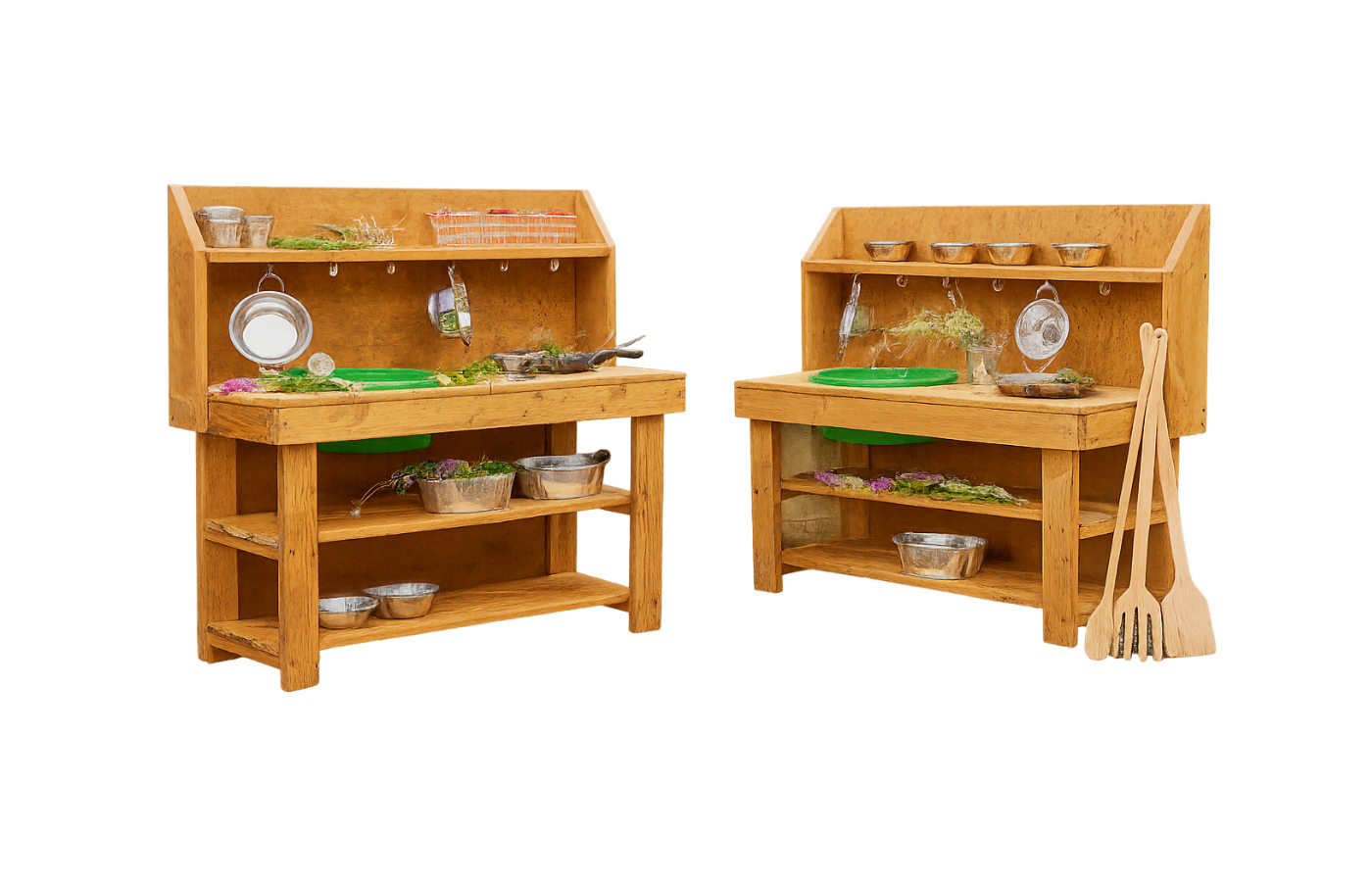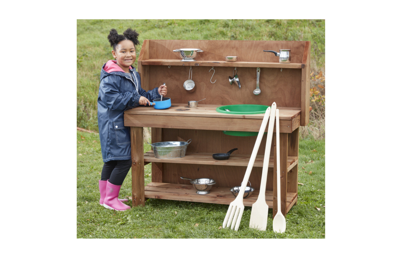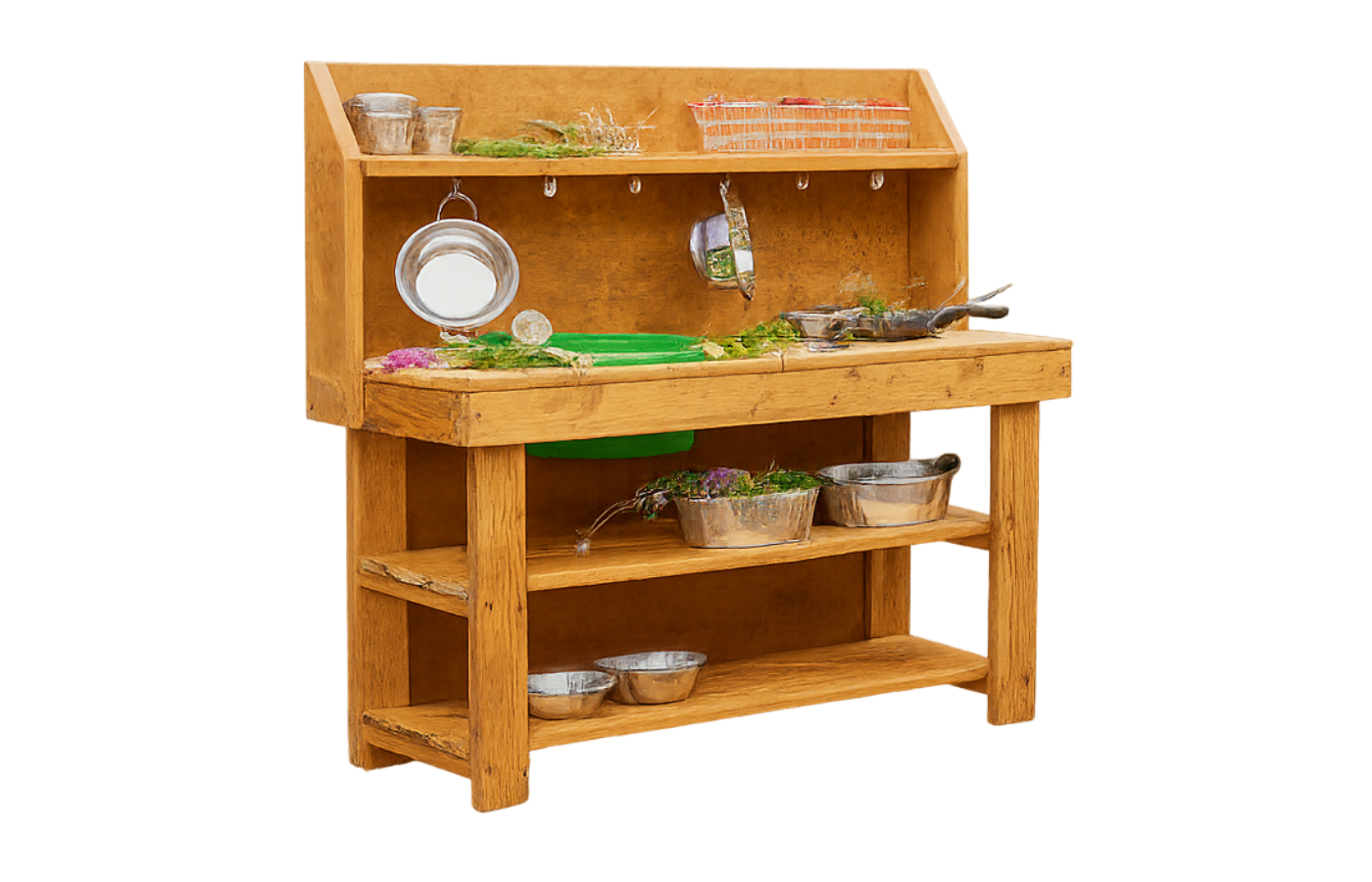 Dit is de ultieme modderkeuken voor kleine modderchefs die niet bang zijn om hun handen vuil te maken. Of het nu gaat om een moddertaart van topklasse of een verrassende takjessoep, deze keuken biedt alle ruimte en stevigheid die nodig is om de creativiteit te laten stromen.