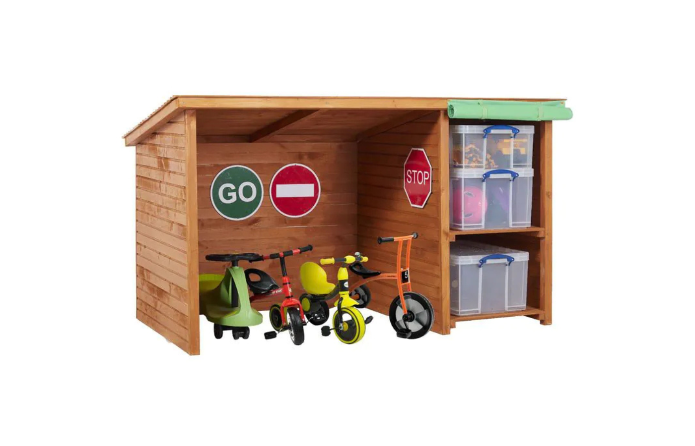 Maak kennis met deze fietsenstalling met opbergruimte, de perfecte oplossing voor het organiseren van uw buitenspeelruimte. Deze weerbestendige schuilplaats houdt fietsen en driewielers droog, georganiseerd en klaar voor gebruik. Eenvoudig te monteren, voorzien van speciale opbergruimte en ingebouwde planken.