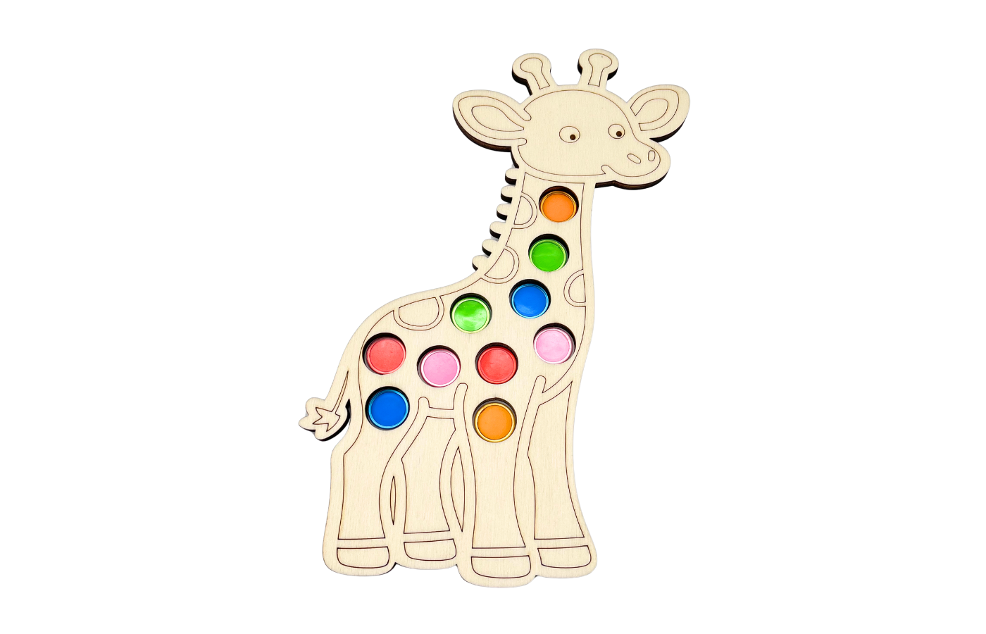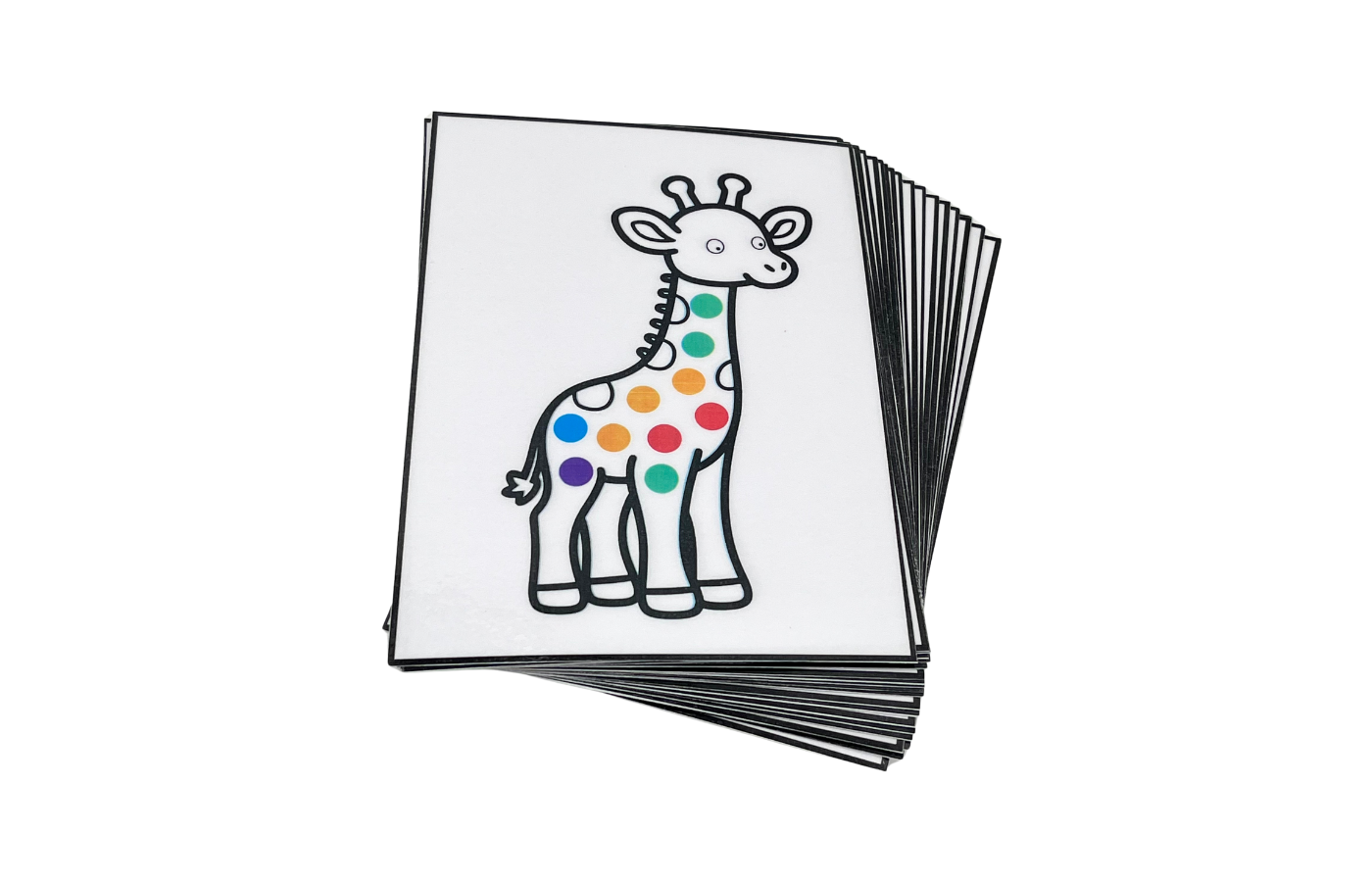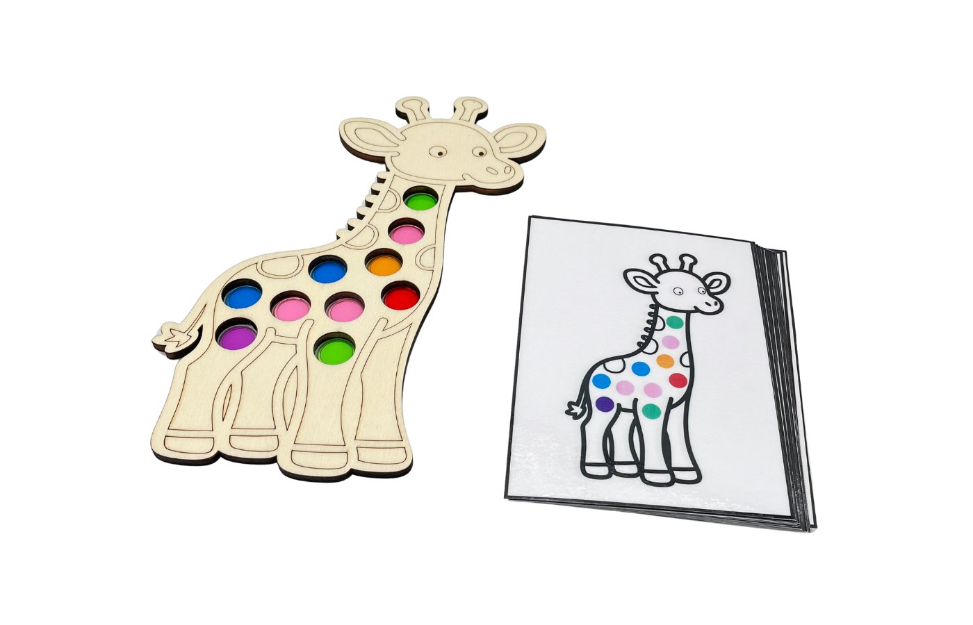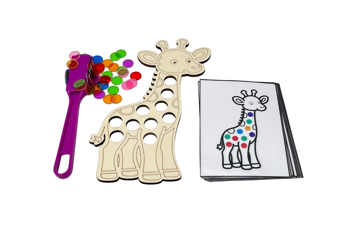 Fijnmotorisch spel met betrekking op ruimtelijke oriëntatie. De kinderen leggen de magneetfiches in de gaatjes van de giraf op basis van een opdrachtkaart. Met de magneetstok kunnen de kinderen de fiches op een leuke manier van het spelbord halen.