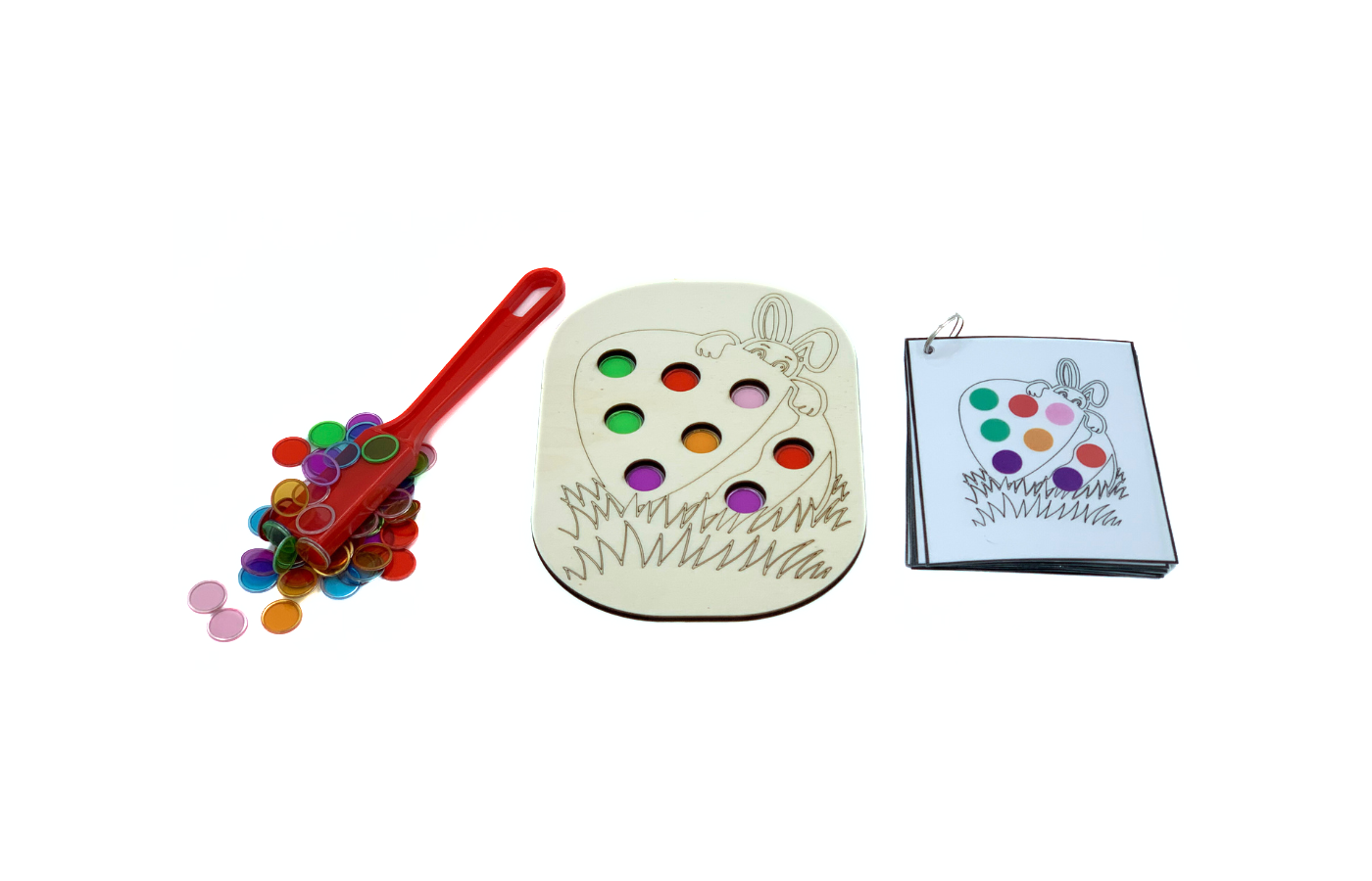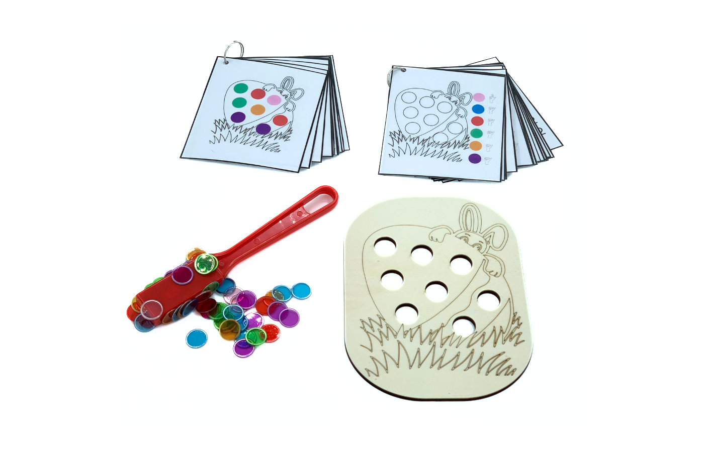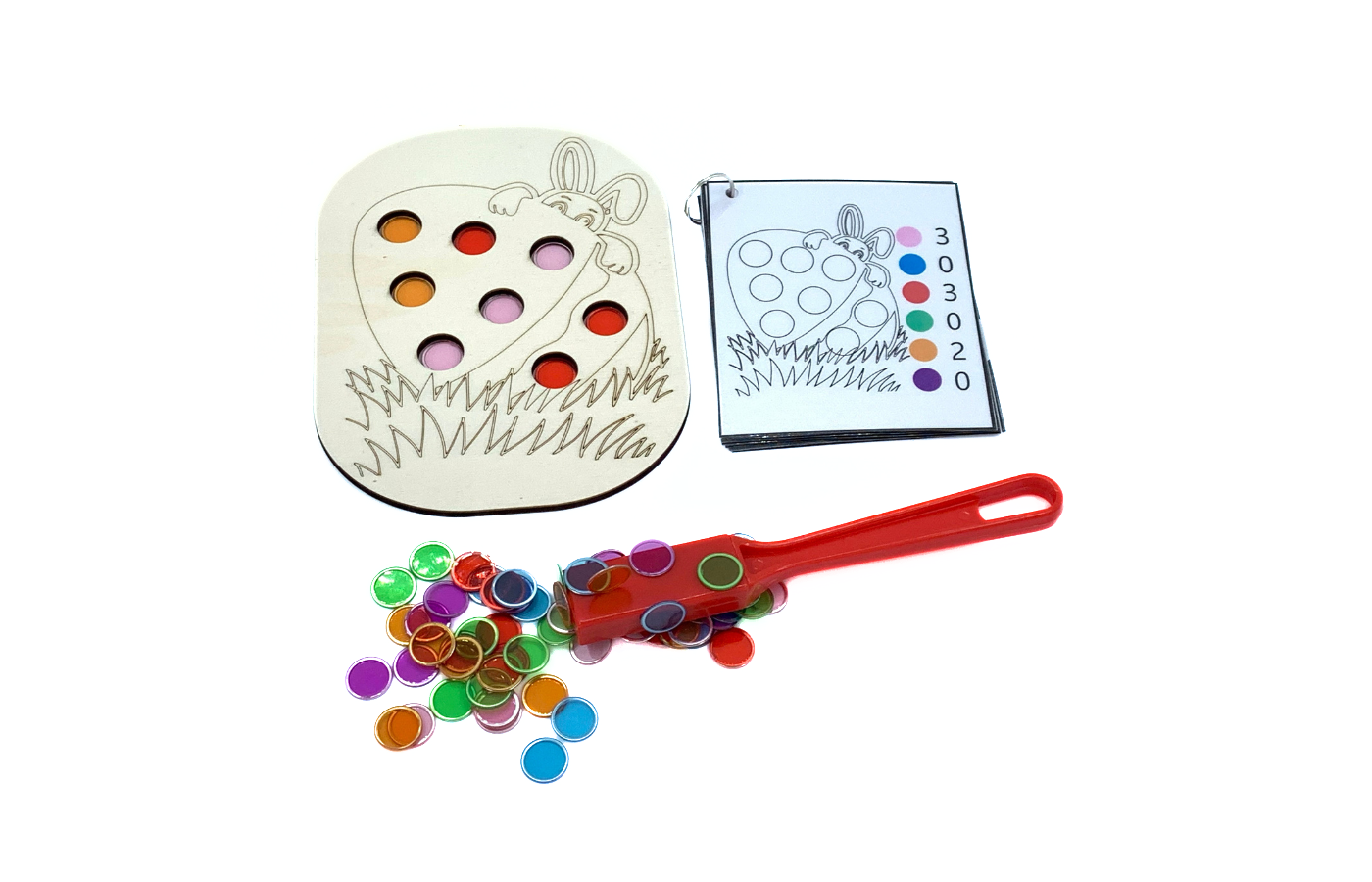 Fijnmotorisch spel met betrekking op ruimtelijke oriëntatie en rekenen. De paashaas zit verstopt achter het ei. De kinderen leggen de magneetfiches in de gaatjes van het ei op basis van een opdrachtkaart. Met de magneetstok kunnen de kinderen de fiches op een leuke manier van het spelbord halen.