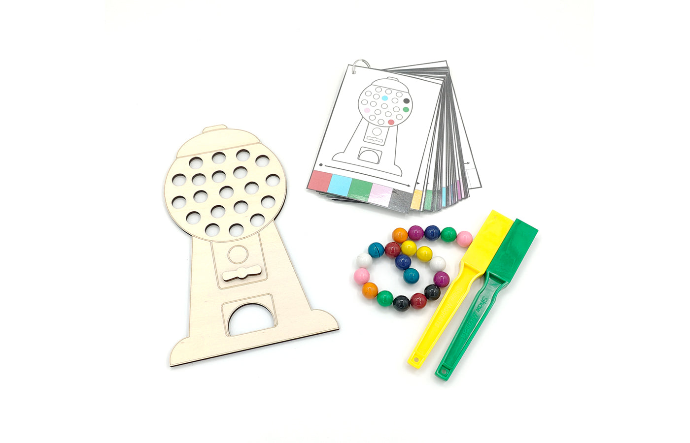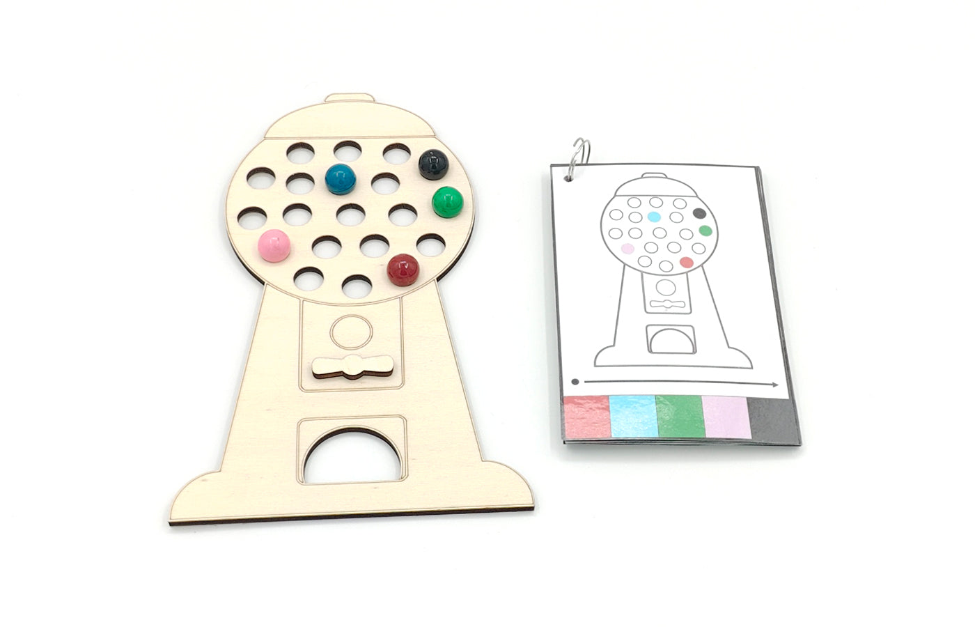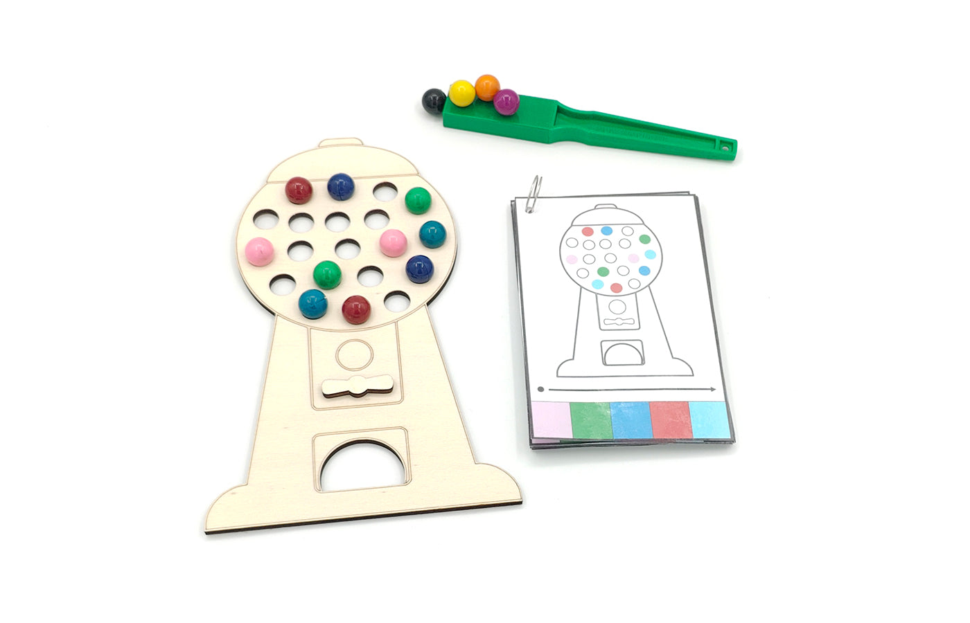 Fijnmotorisch spel met betrekking op ruimtelijke oriëntatie. De kinderen vullen hun kauwgomautomaat op basis van een opdrachtkaart. De magnetische balletjes worden in de automaat gelegd in een bepaalde volgorde op basis van gedifferentieerde opdrachtkaarten. Daarna kunnen ze deze van de automaat halen met hun magneetstok.