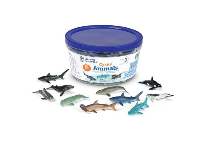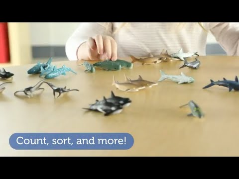 Tel, sorteer en classificeer met deze duurzame, zachte rubberen tellers. De set bestaat uit 50 oceaandieren, 10 verschillende dieren (walvissen, haaien, roggen) in levensechte kleuren.