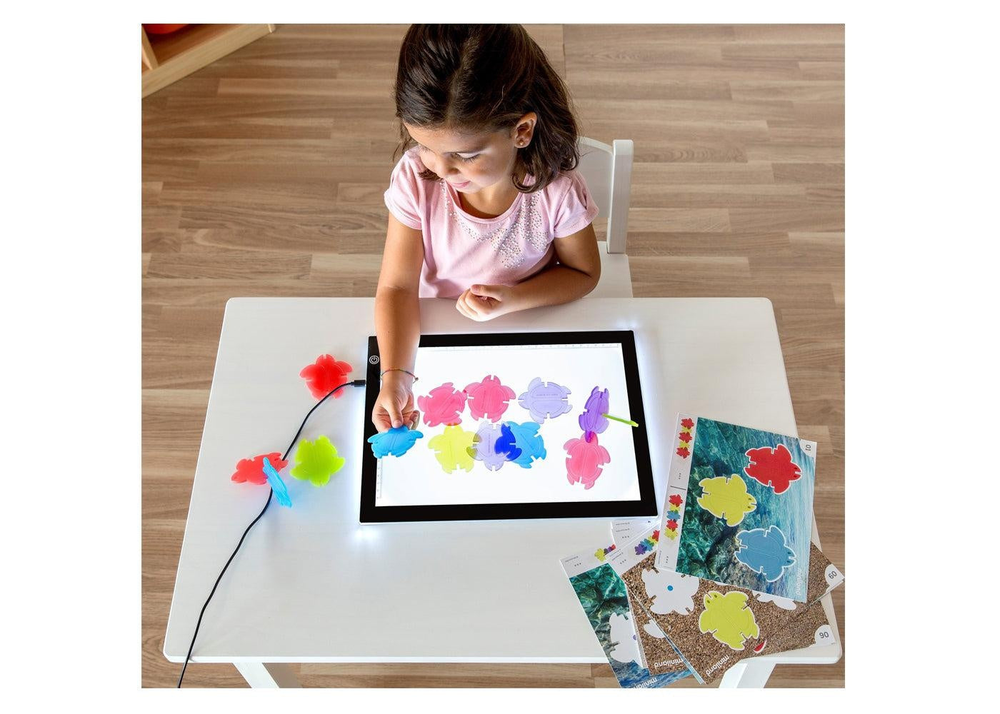 Doorzichtige gekleurde schildpadden. Een set van 20 doorzichtige schildpadden en 9 opdrachtkaarten. De opdrachtkaarten zijn opgebouwd in verschillende thema's en verschillende moeilijkheidsgraad. Door de figuren in de kaarten te identificeren en te associëren, leren kinderen kleuren te onderscheiden en werken ze aan ruimtelijke oriëntatie. De schildpadden hebben 4 verschillende kleuren. Dit artikel is zeer geschikt om te gebruiken op de lichttafel.