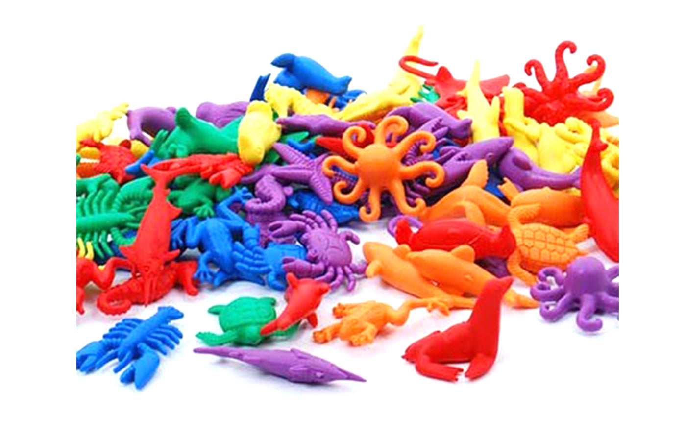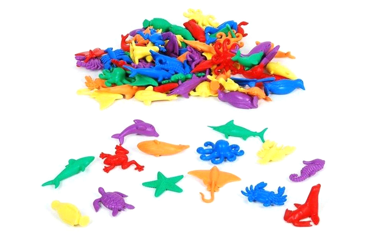 Tel, sorteer en classificeer met deze duurzame, zachte rubberen tellers. De set bestaat uit 84 waterdieren, 14 verschillende dieren (krab, dolfijn, kikker, kreeft, octopus, pinguïn, zeehond, zeepaard, zeester, haai, rog, zwaardvis, schildpad en walvis) in 6 kleuren.