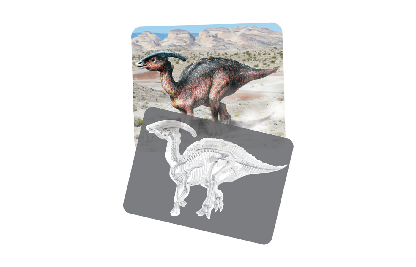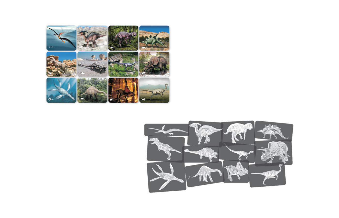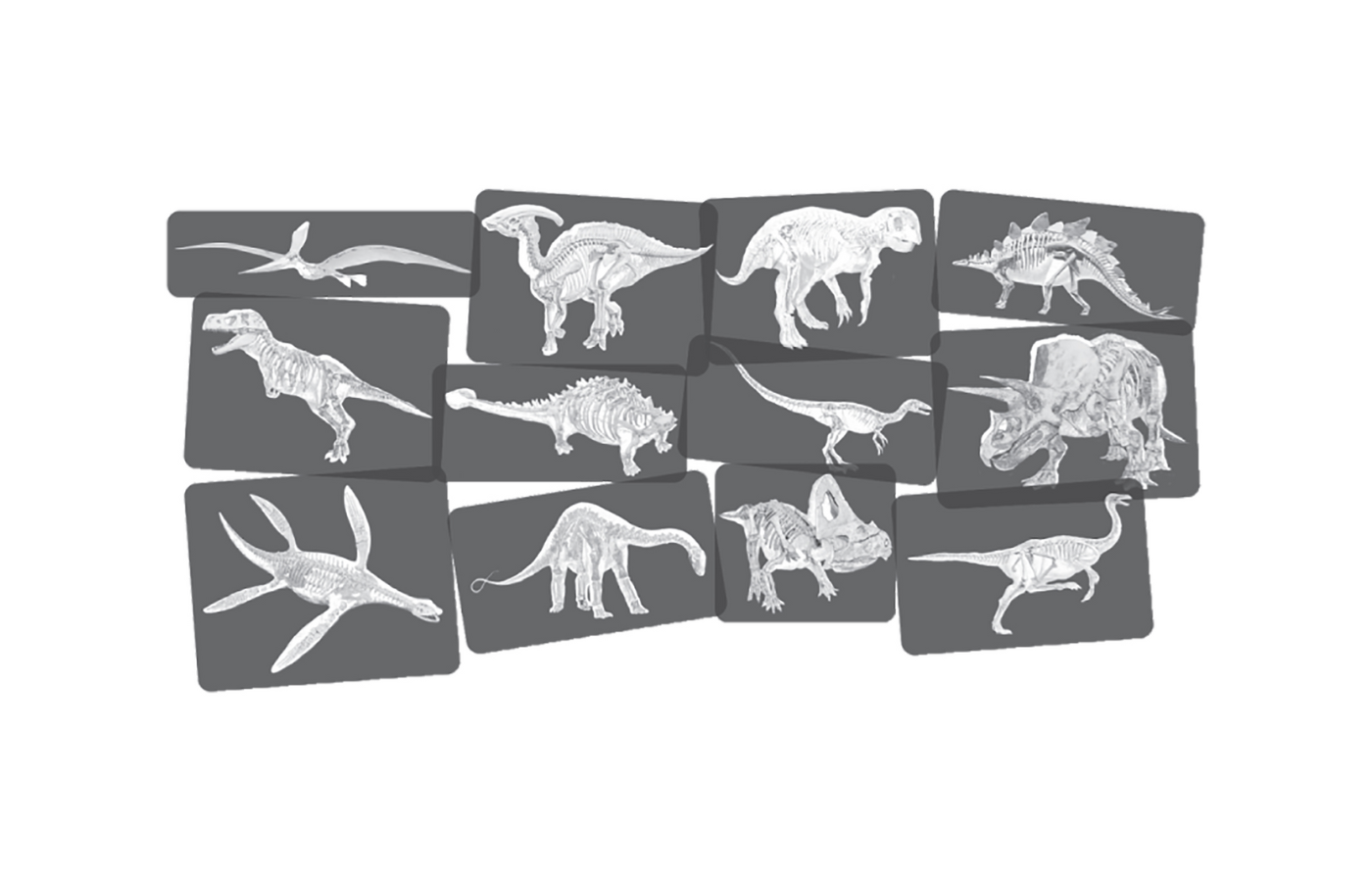 Introduceer paleontologie bij jonge kinderen met 12 prachtige ontdekkingskaarten en bijpassende röntgenfoto's. Leg de röntgenfoto's over de fotokaarten om de lichamen van binnenuit te bekijken.