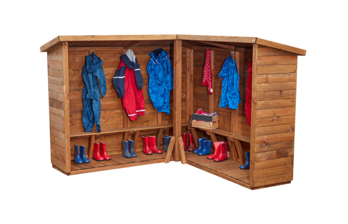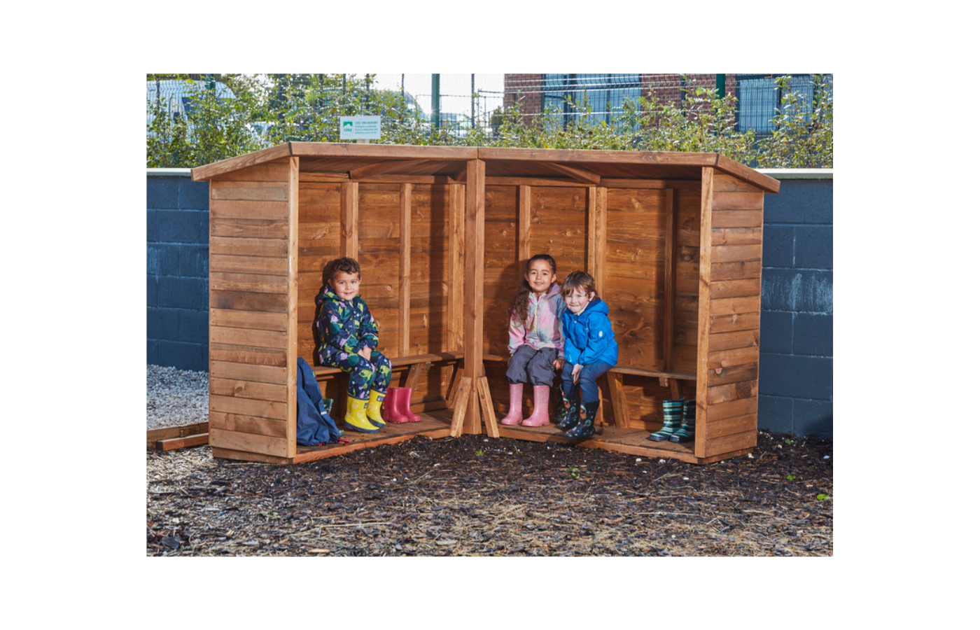 Creƫer een levendige en inspirerende ruimte in je buitenomgeving met onze hoek boshut. Perfect voor groepen kinderen die zich voorbereiden op een bosklas of op ontdekkingstocht gaan in de natuur. Dit slimme ontwerp biedt de ideale plek om samen te komen, laarzen aan te trekken of klaar te maken voor het volgende avontuur.