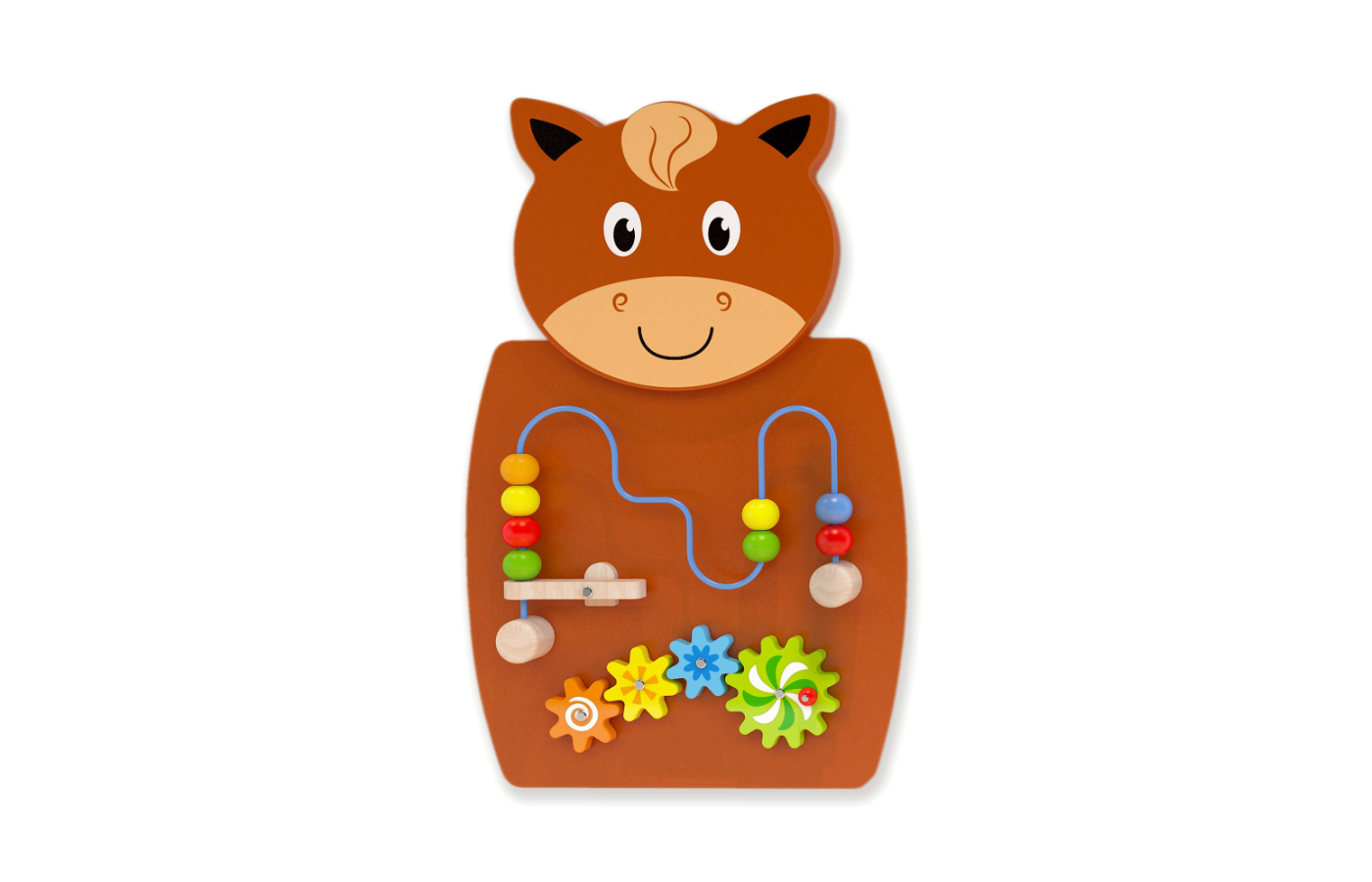 Houten activiteit wandpaneel in de vorm van een paard, giraf of zebra. Het wandpaneel heeft verschillende manipulatieve activiteiten om de hand-oogcoördinatie en fijne motoriek te stimuleren. Het paneel in de vorm van een paard met kralen en tandwielen, een gele giraf met fruitpuzzelblokken en een zwart-witte zebra met kleurrijke vormen.