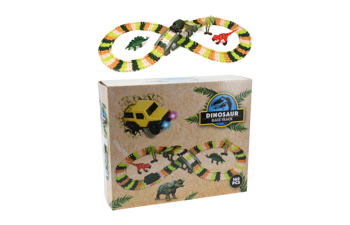 Autobaan speelset in het thema dinosaurussen op verschillende manieren te combineren met elkaar. Inclusief zelfrijdende lichtgevende auto.