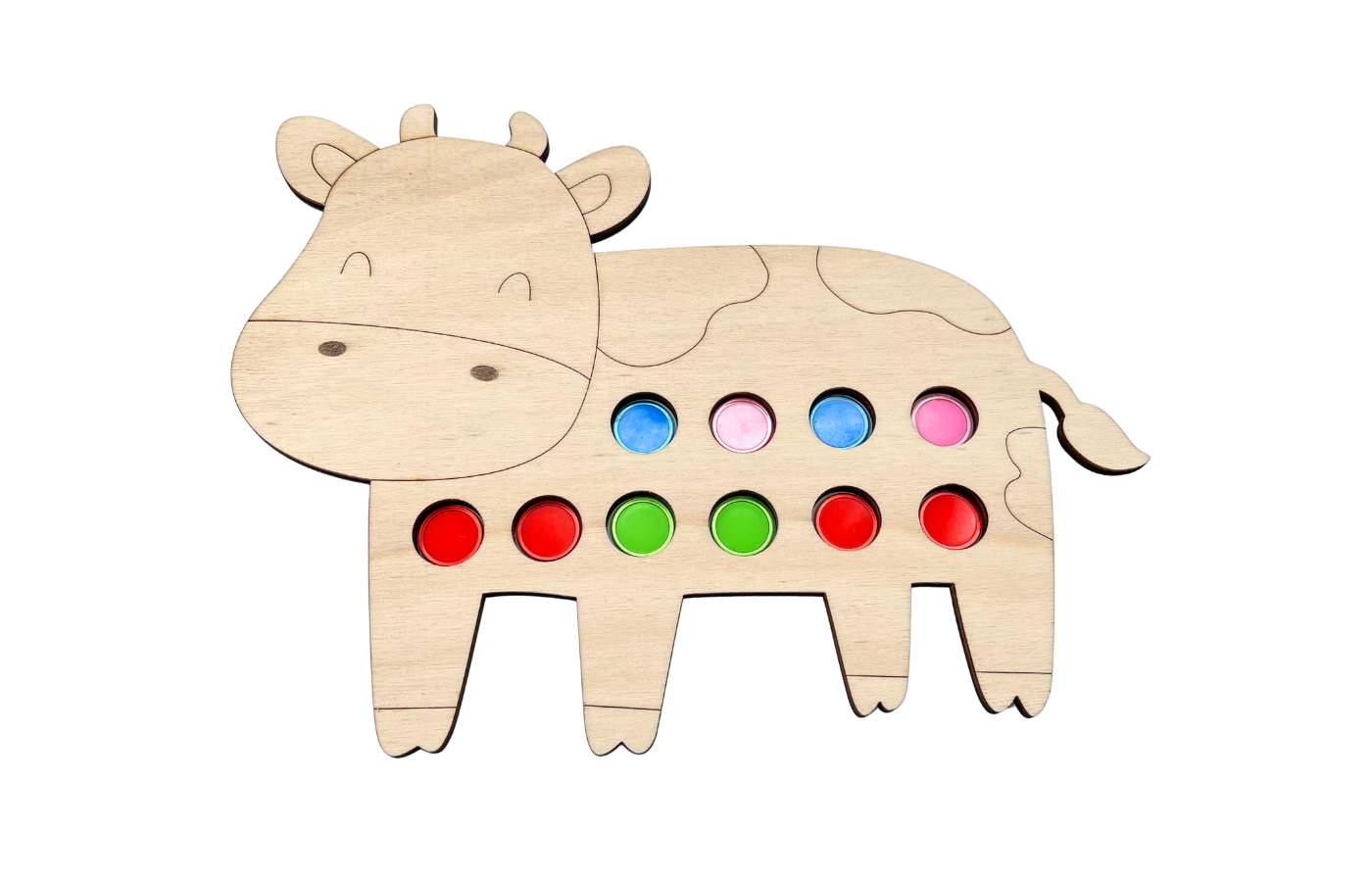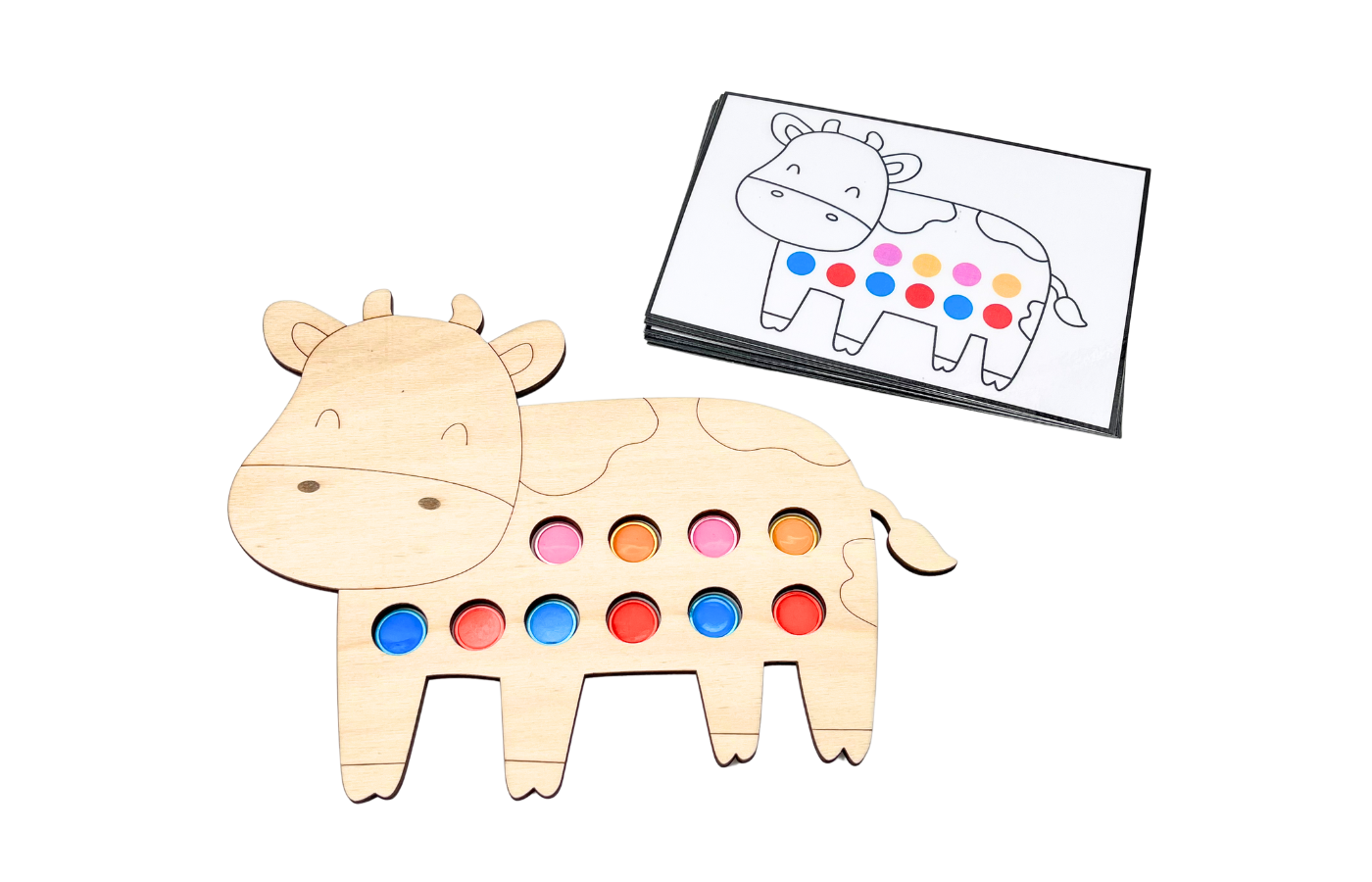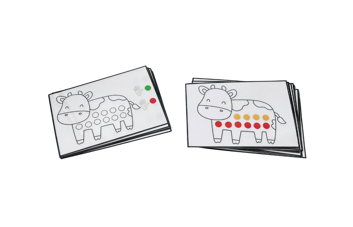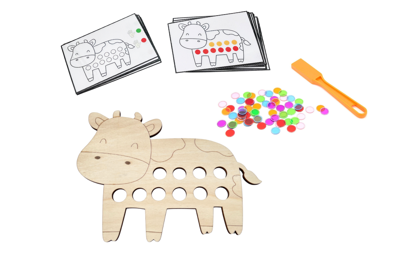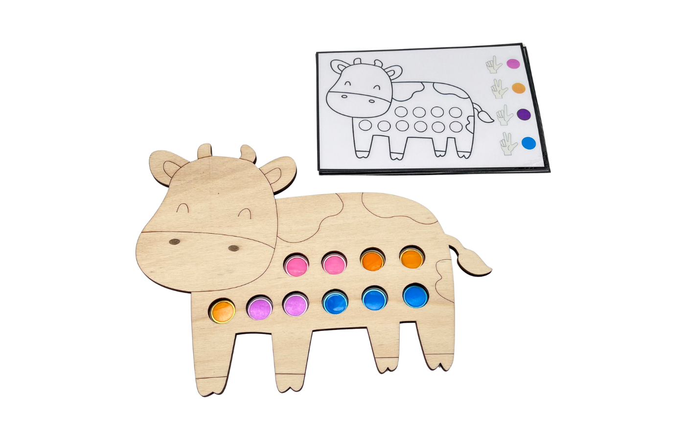 Fijnmotorisch spel met betrekking op ruimtelijke oriëntatie en rekenen. De kinderen leggen de magneetfiches in de gaatjes van de koe op basis van een opdrachtkaart. Met de magneetstok kunnen de kinderen de fiches op een leuke manier van het spelbord halen.
