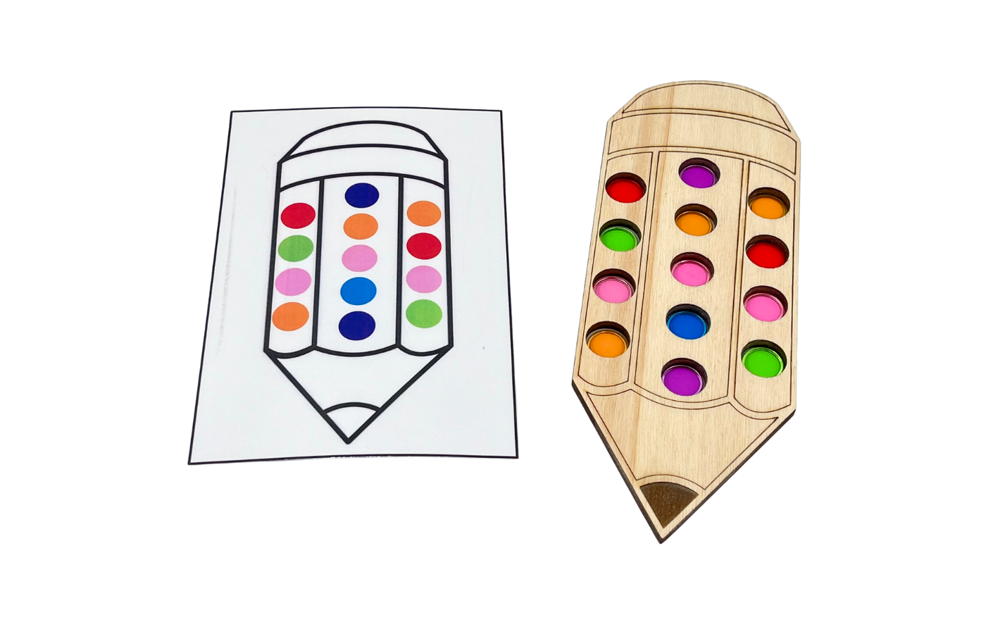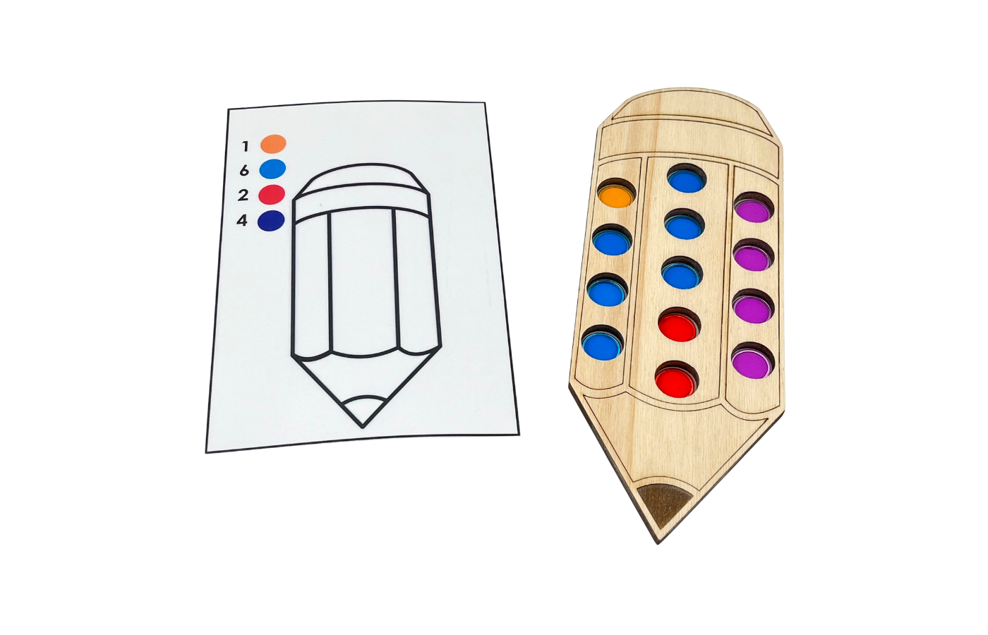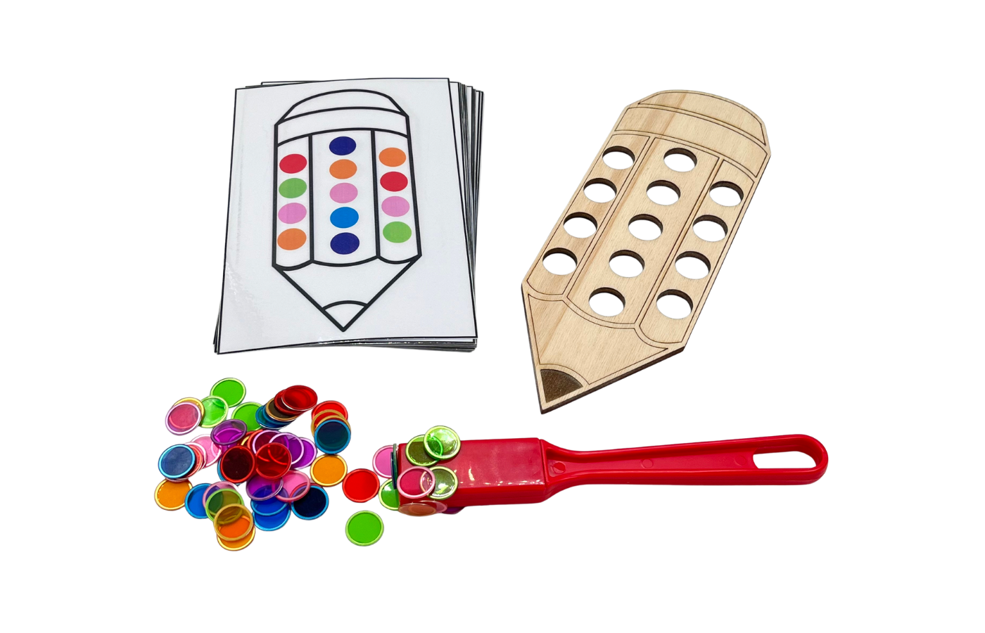 Fijnmotorisch spel met betrekking op ruimtelijke oriëntatie en rekenen. De kinderen leggen de magneetfiches in de gaatjes van het potlood op basis van een opdrachtkaart. Met de magneetstok kunnen de kinderen de fiches op een leuke manier van het spelbord halen.