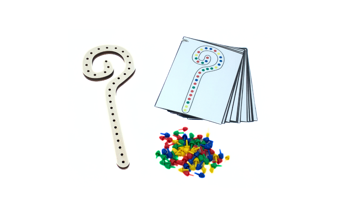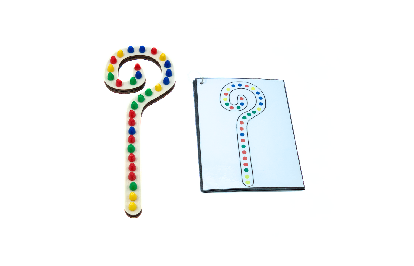 Spel met betrekking tot ruimtelijke oriëntatie en fijne motoriek. Versier de staf van de Sint met je favoriete kleuren! De kinderen ordenen de gekleurde parels op de staf op basis van opdrachtkaarten. Differentiatie is geïntegreerd in de 15 opdrachtkaarten. (zelf afdrukken en lamineren). Een vrije creatie maken is natuurlijk ook mogelijk. Inclusief 60 gekleurde parels (rood, geel, groen en blauw).