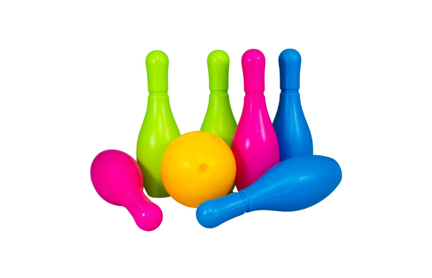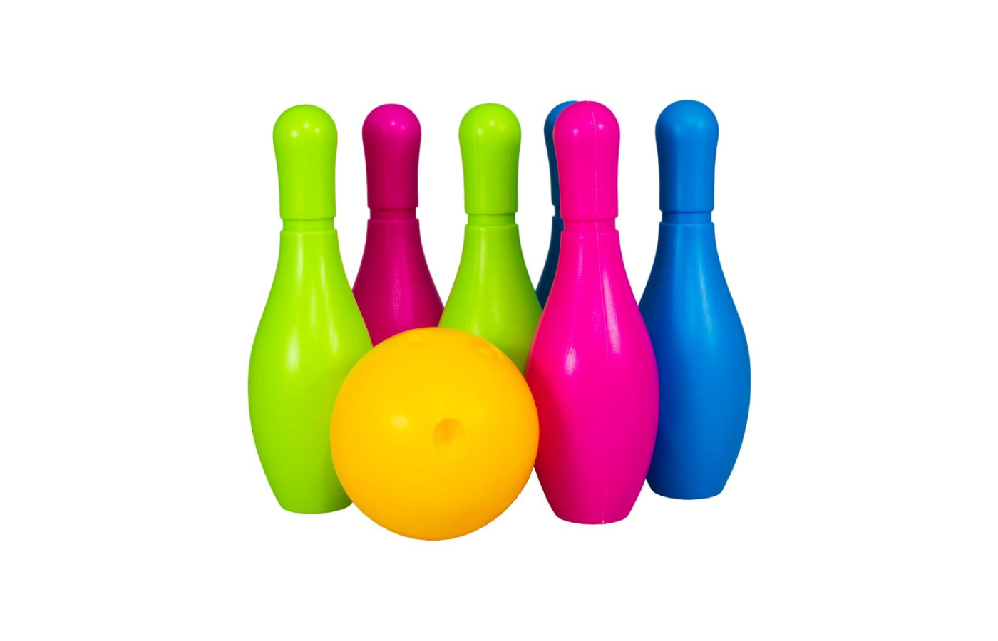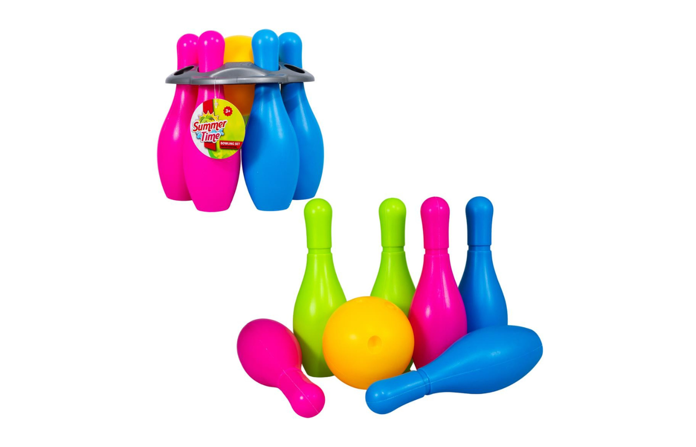 Bowling set, bestaande uit 6 kegels in de kleuren roze, blauw, groen en een gele bal. Voorzien van handig opbergframe.