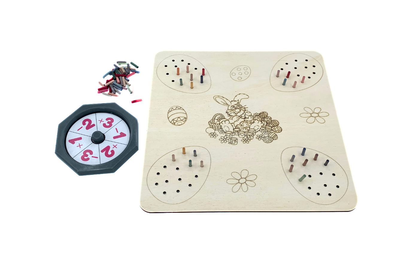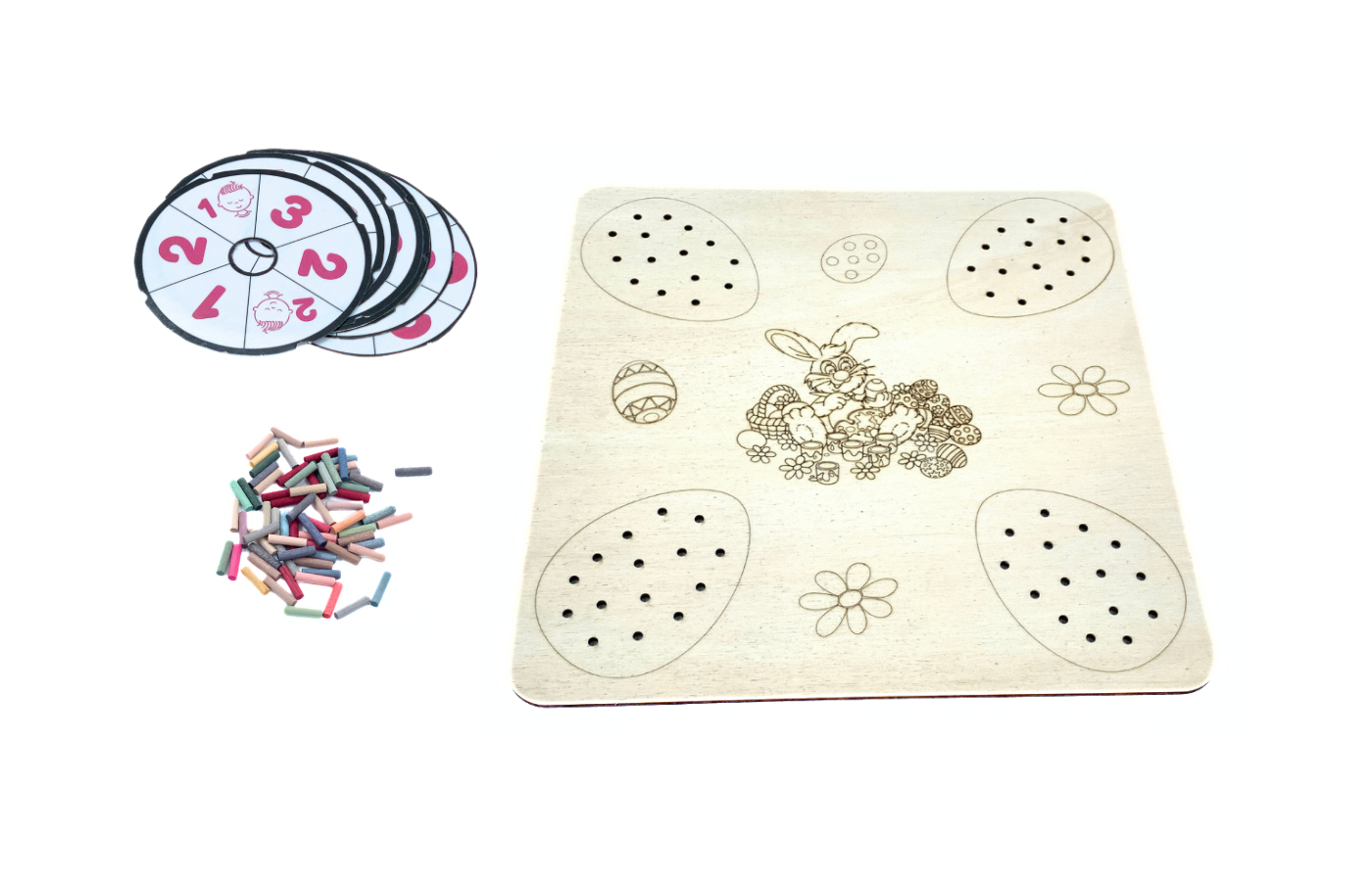 Fijnmotorisch bordspel Pasen met betrekking op rekenen. Draai aan de Cspinner en geef je paasei het juiste aantal pinnetjes. Verschillende spelvormen mogelijk met de Cspinnerkaarten.