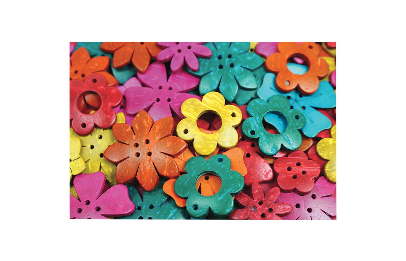 Een zakje van 150 gr. kokosnoot schelpen - bloemen in verschillende kleuren. Te gebruiken als decoratie, om te tellen of om mee te knutselen.