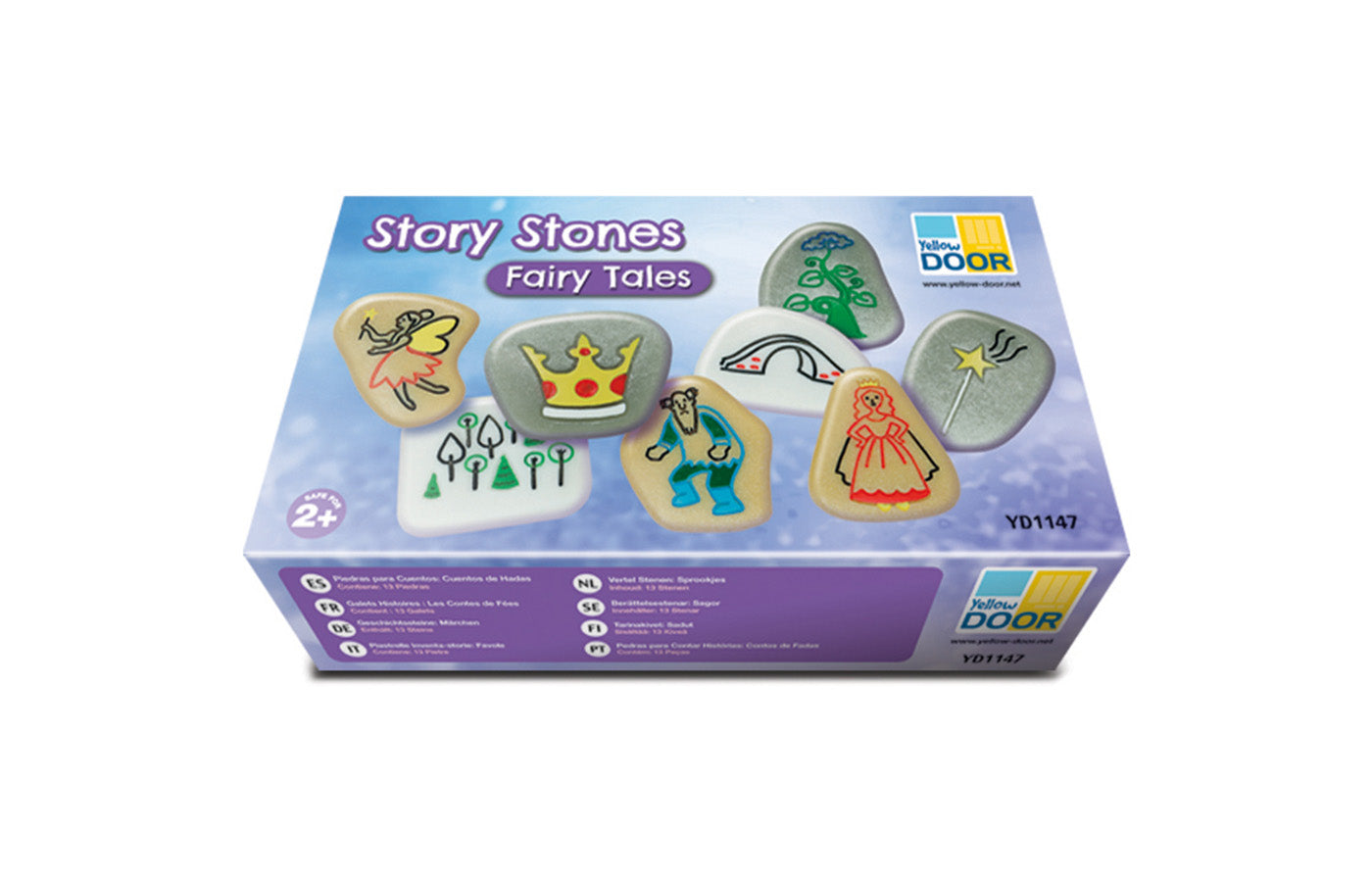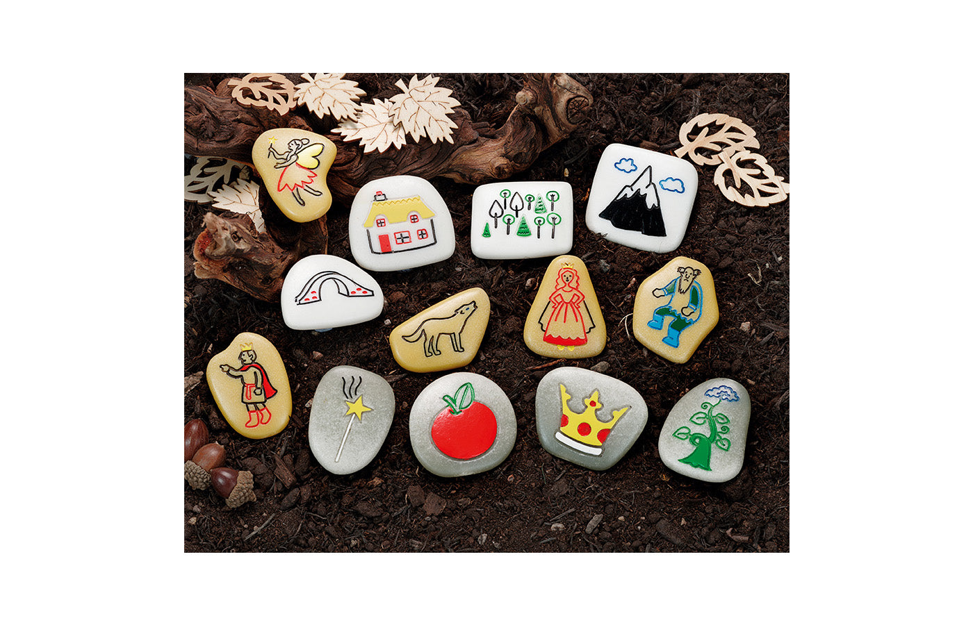 set van 13 verschillende vertelstenen in het thema 'sprookjes' (afm. grootste 5 x 5 cm)