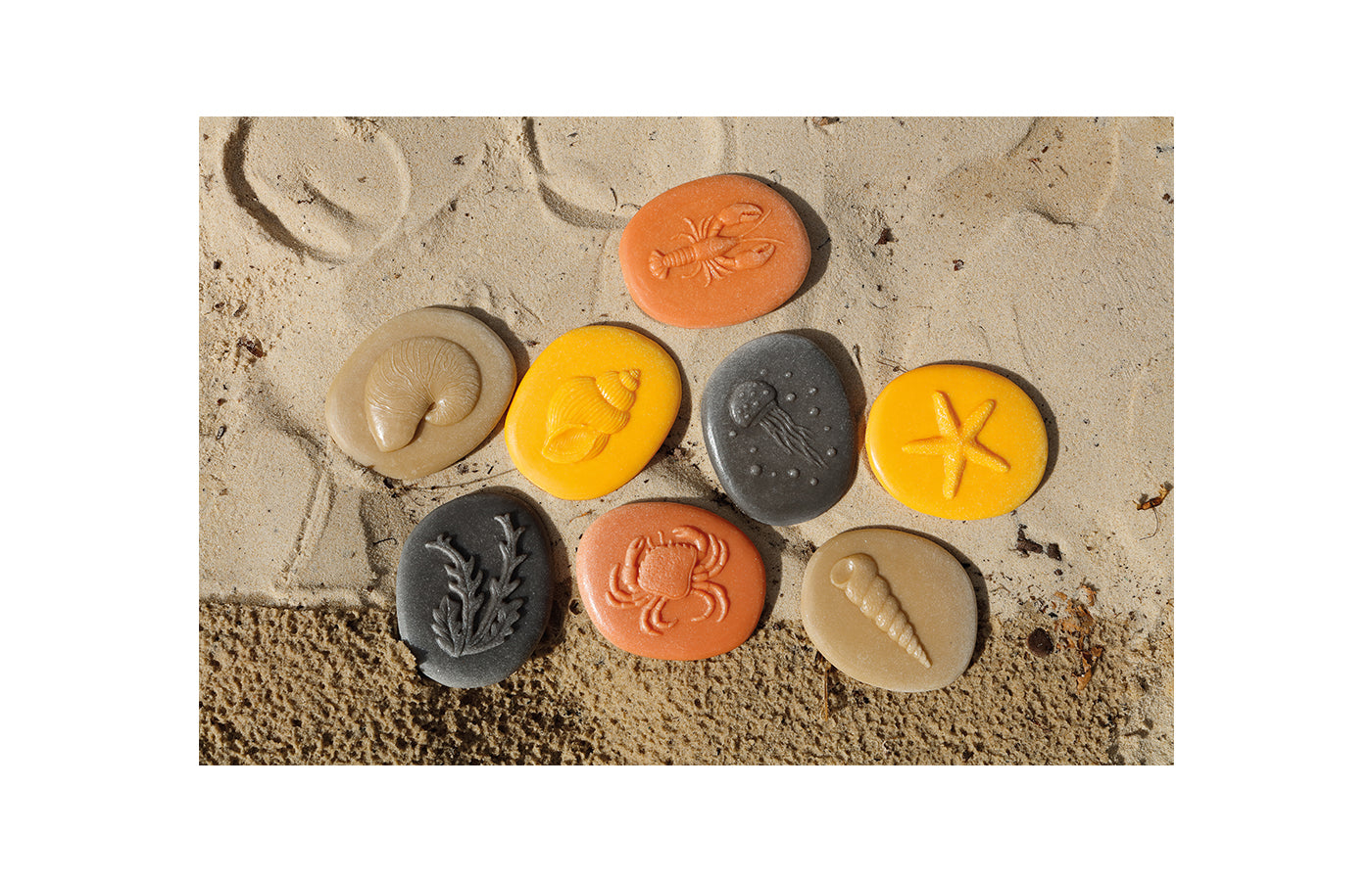 De set bevat acht stenen: 3 schelpen, krab, kwal, kreeft, zeewier en een zeester.