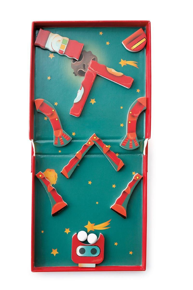 2-in-1: puzzel en knikkerbaan met 5 knikkers in het thema robot. De open gevouwen afmeting is 15,5 x 32,5 x 2 cm.