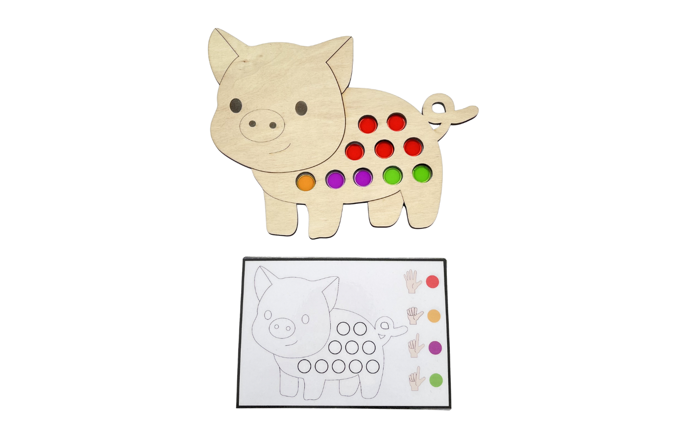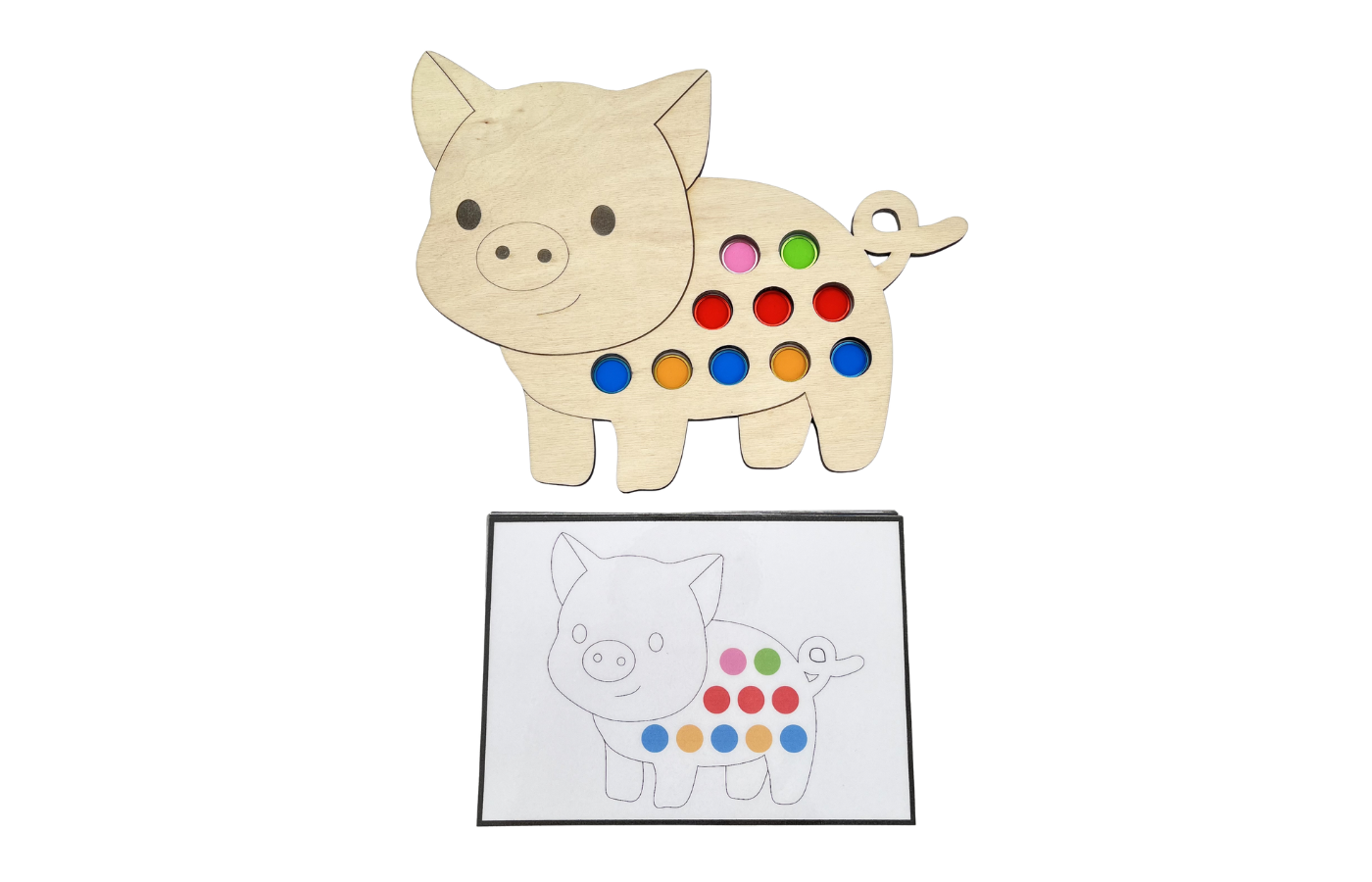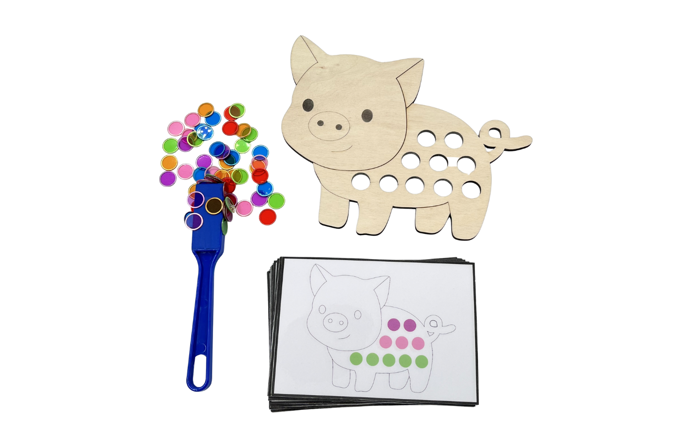 Fijnmotorisch spel met betrekking op ruimtelijke oriëntatie en rekenen. De kinderen leggen de magneetfiches in de gaatjes van het varken op basis van een opdrachtkaart. Met de magneetstok kunnen de kinderen de fiches op een leuke manier van het spelbord halen.