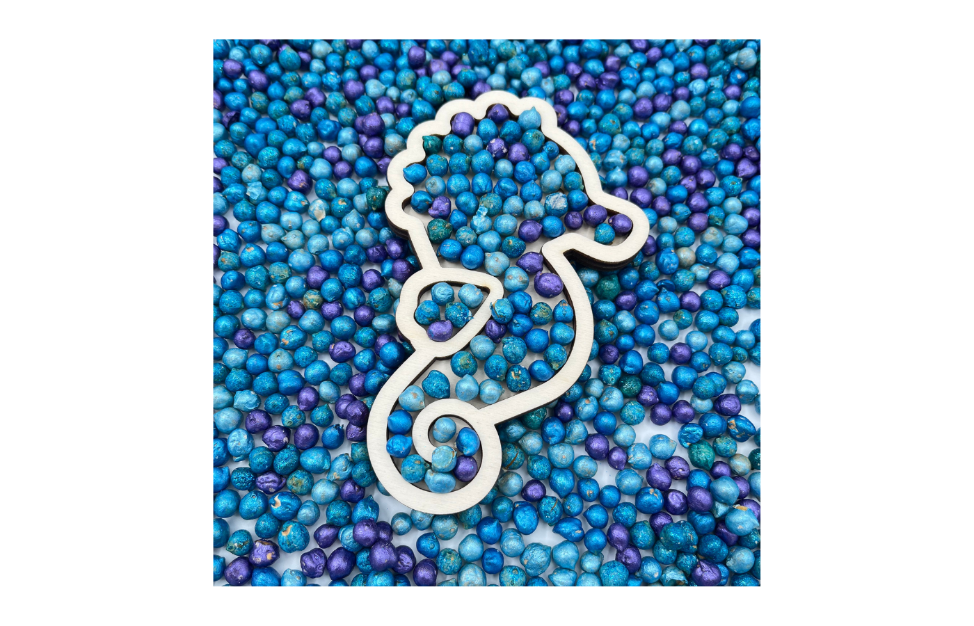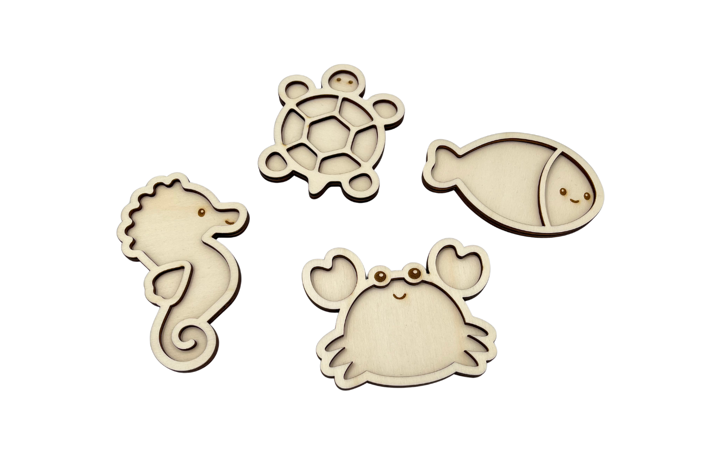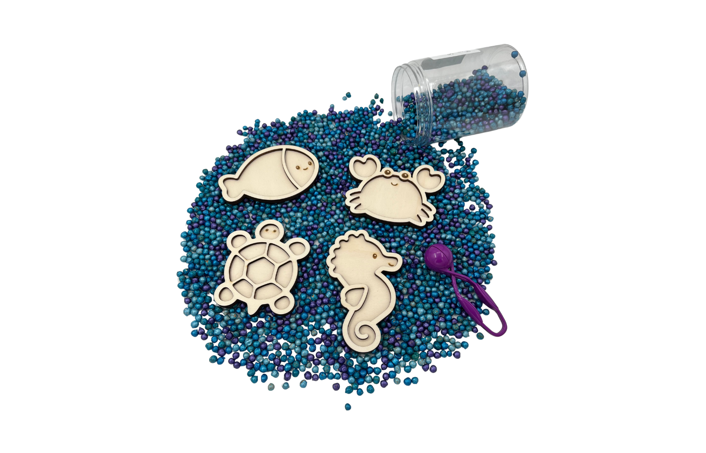 Vulvormen of speeltrays in het thema onderwater dieren. Een vis, zeepaardje, zeeschildpad en krab. Perfect te vullen met droge materialen zoals speelrijst, kikkererwten, fijn zand,... In een schattig formaat.