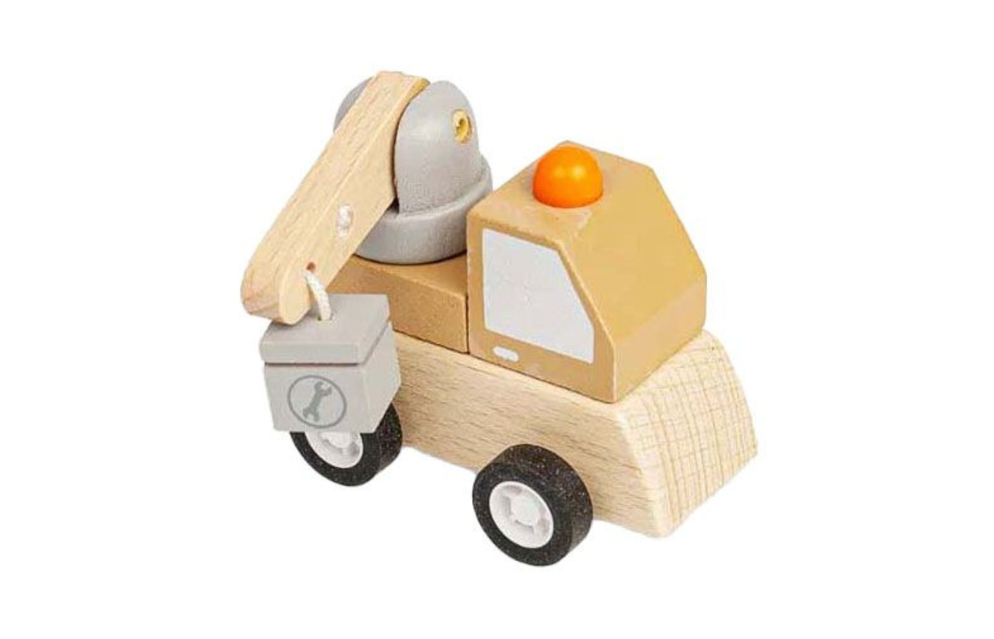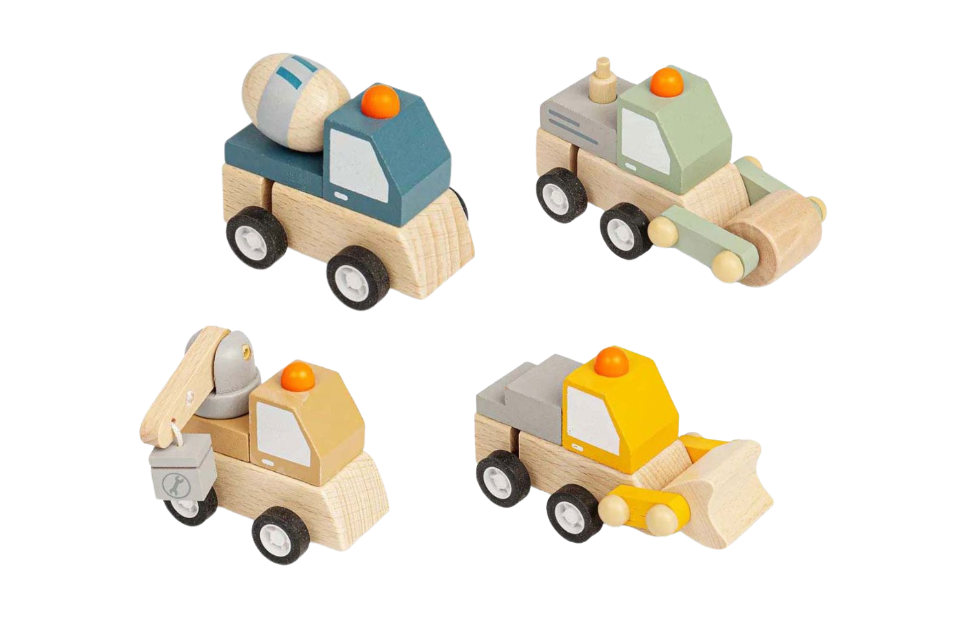 Deze vier werkvoertuigen staan klaar om aan het werk te beginnen! Deze houten voertuigen in vier kleurrijke variaties passen goed in elke kinderhand en rijden zelf met een eenvoudig opwindmechanisme. Of het nu de wals, de betonmixer, de kraan of de graafmachine is - deze bouwvoertuigen zijn gegarandeerd een succes. Ook ideaal als klein geschenk. Deze voertuigen worden per stuk verkocht.