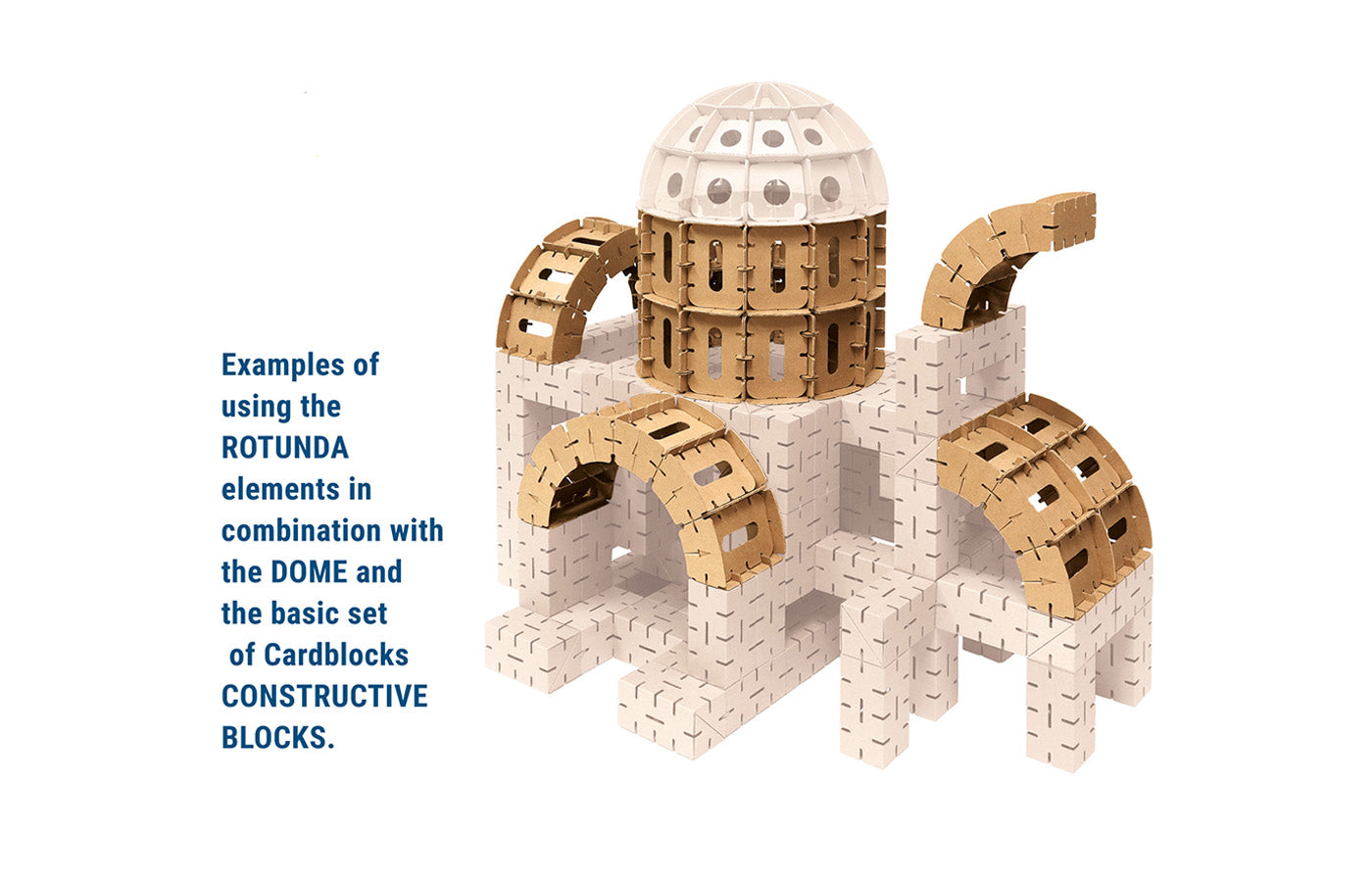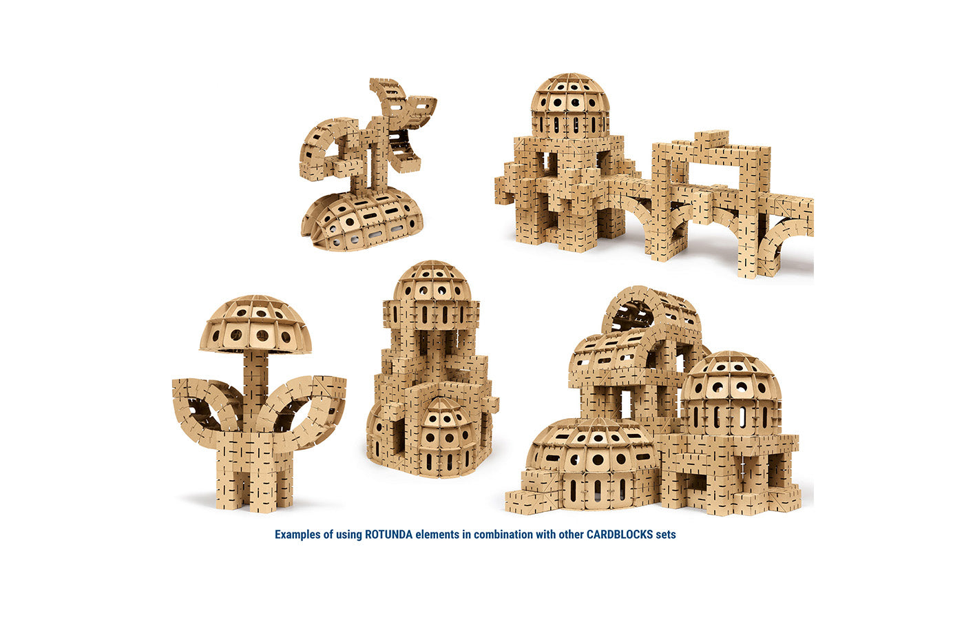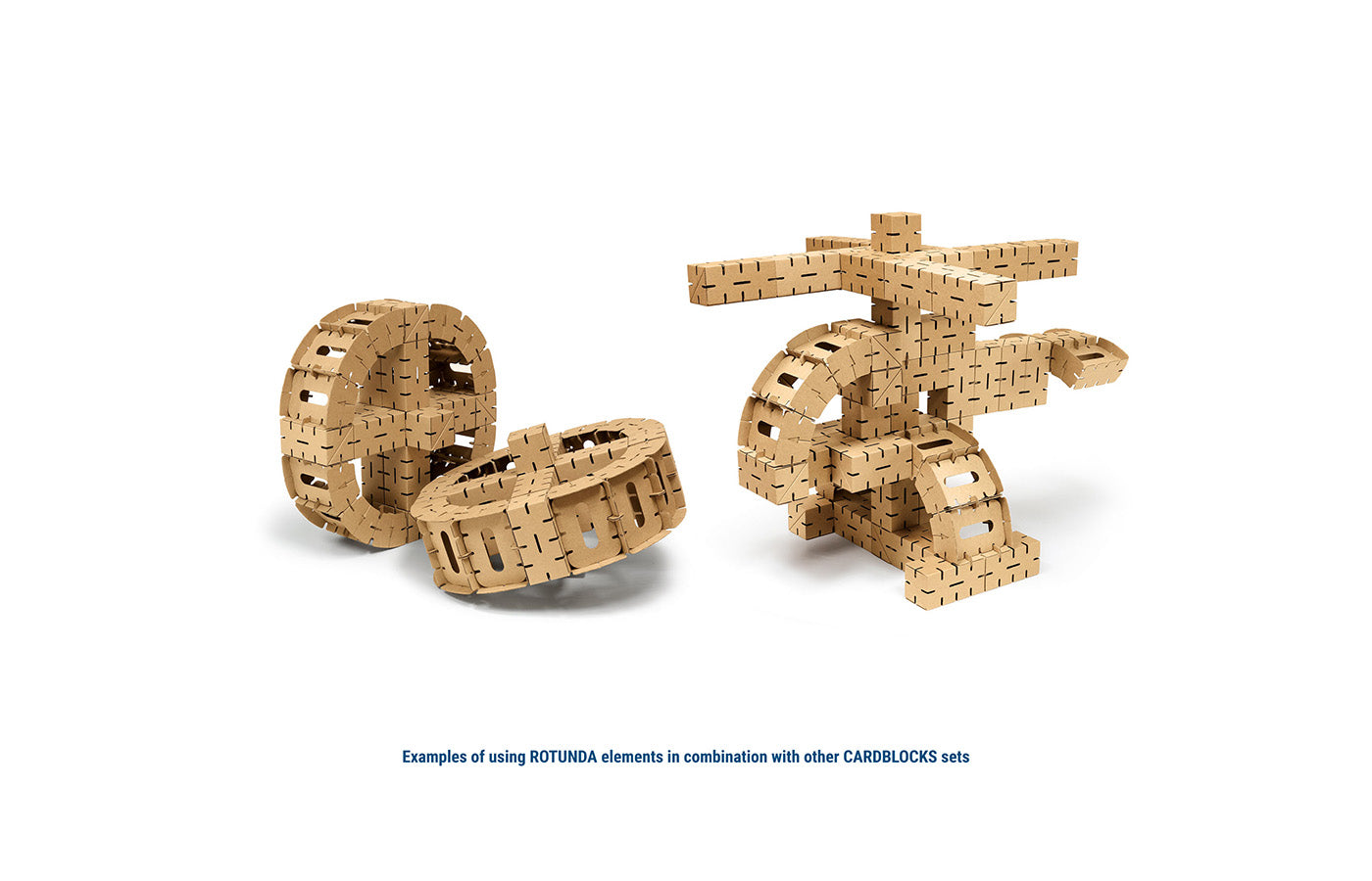 Les Card Blocks sont des blocs en carton à assembler soi-même. La combinaison d'un Block avec un design original et un Connector particulier offre des possibilités inédites pour construire des formes spatiales. La rotonde montée a un diamètre de 36 cm. Combinez différents ensembles pour créer des constructions encore plus spectaculaires.