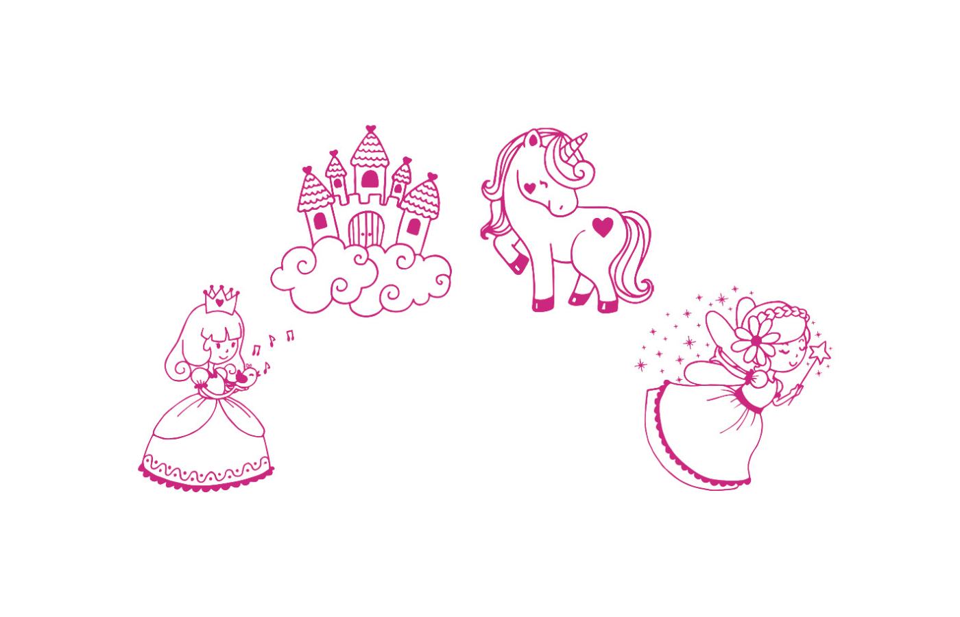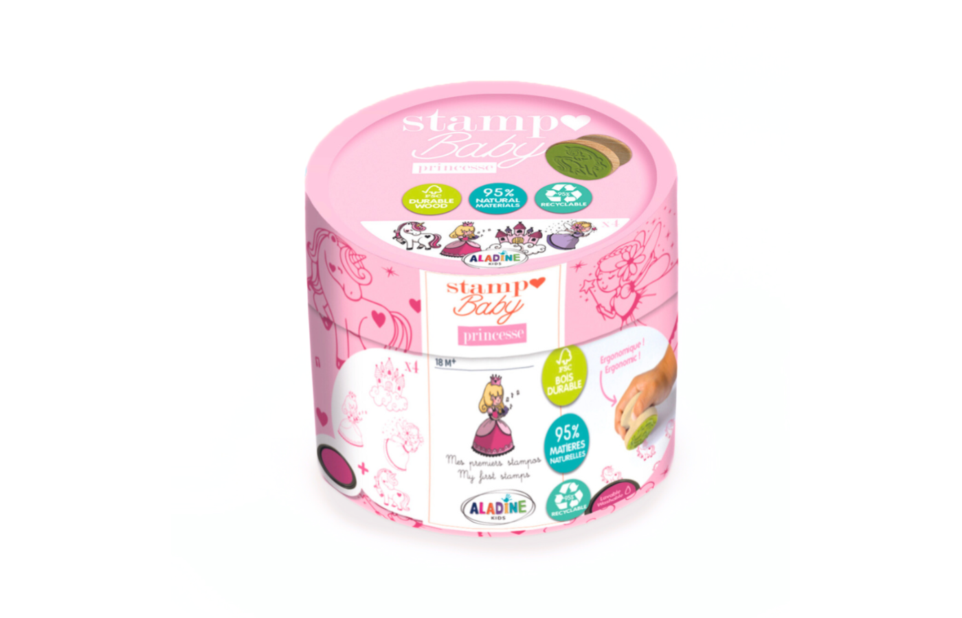 Ensemble de 4 tampons en bois ergonomiques sur le thème des princesses, adaptés aux mains des enfants à partir de 18 mois. Le bois FSC provient de forêts gérées de manière durable. L'emballage contient également un coussin encreur conforme aux normes actuelles pour les enfants.