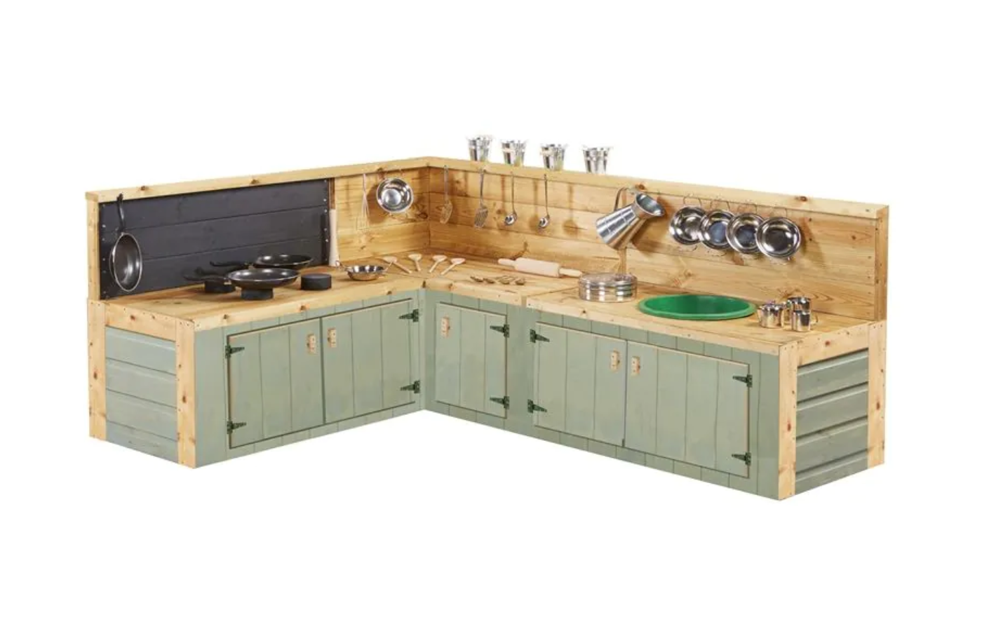 Maak kennis met deze landelijke groene hoekkeuken: een stijlvolle modderkeuken die buitenspelen naar een hoger niveau tilt. Met haar prachtige saliegroene kleur brengt ze een natuurlijke, rustgevende uitstraling in elke buitenruimte.