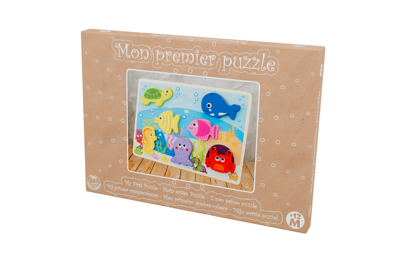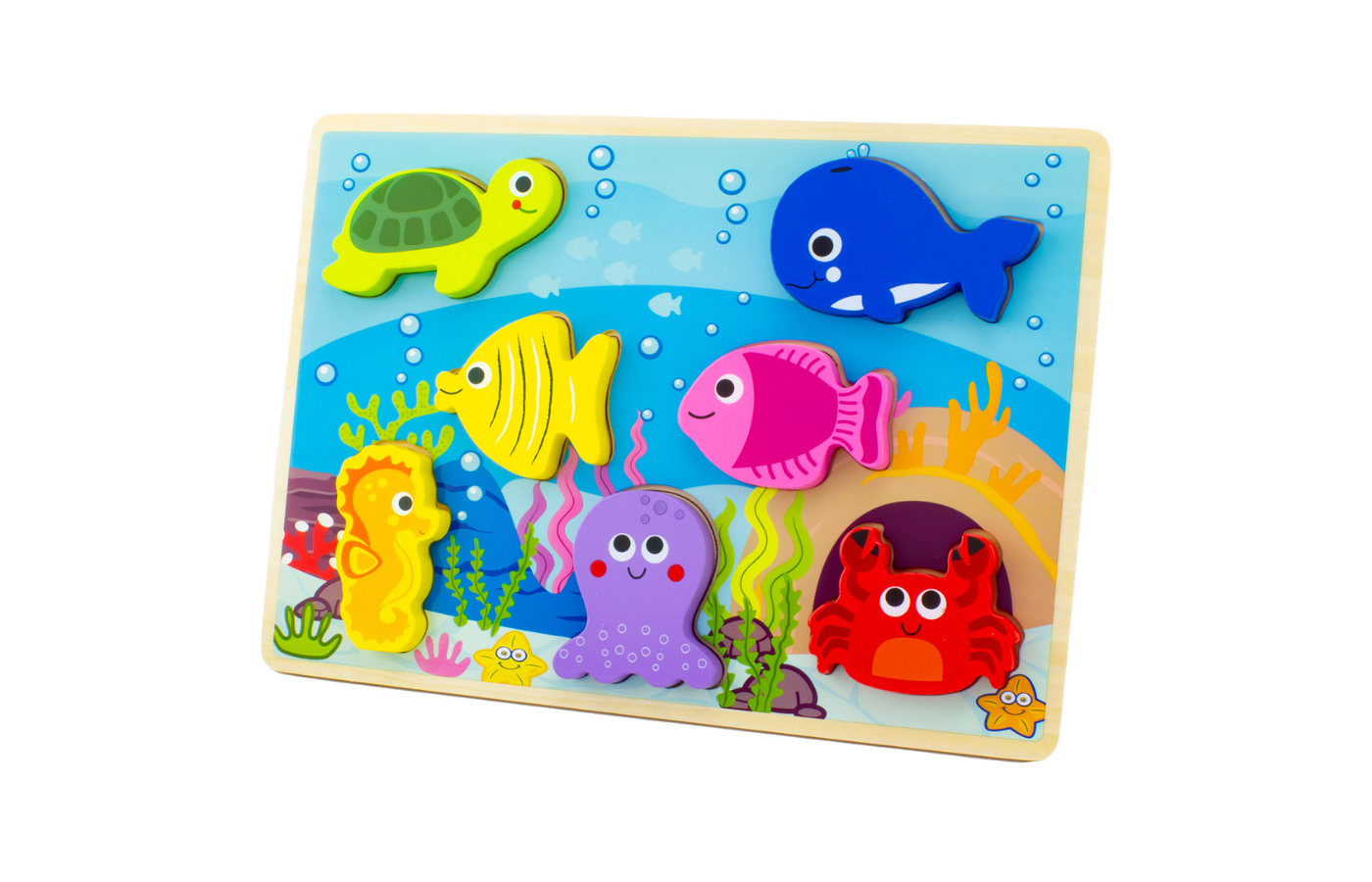 Deze vrolijke houten inlegpuzzel is ideaal voor een eerste kennismaking met puzzelen. Leg de felgekleurde stukken van de puzzel op de juiste plaats op het inlegbord.