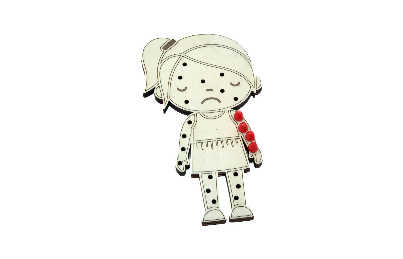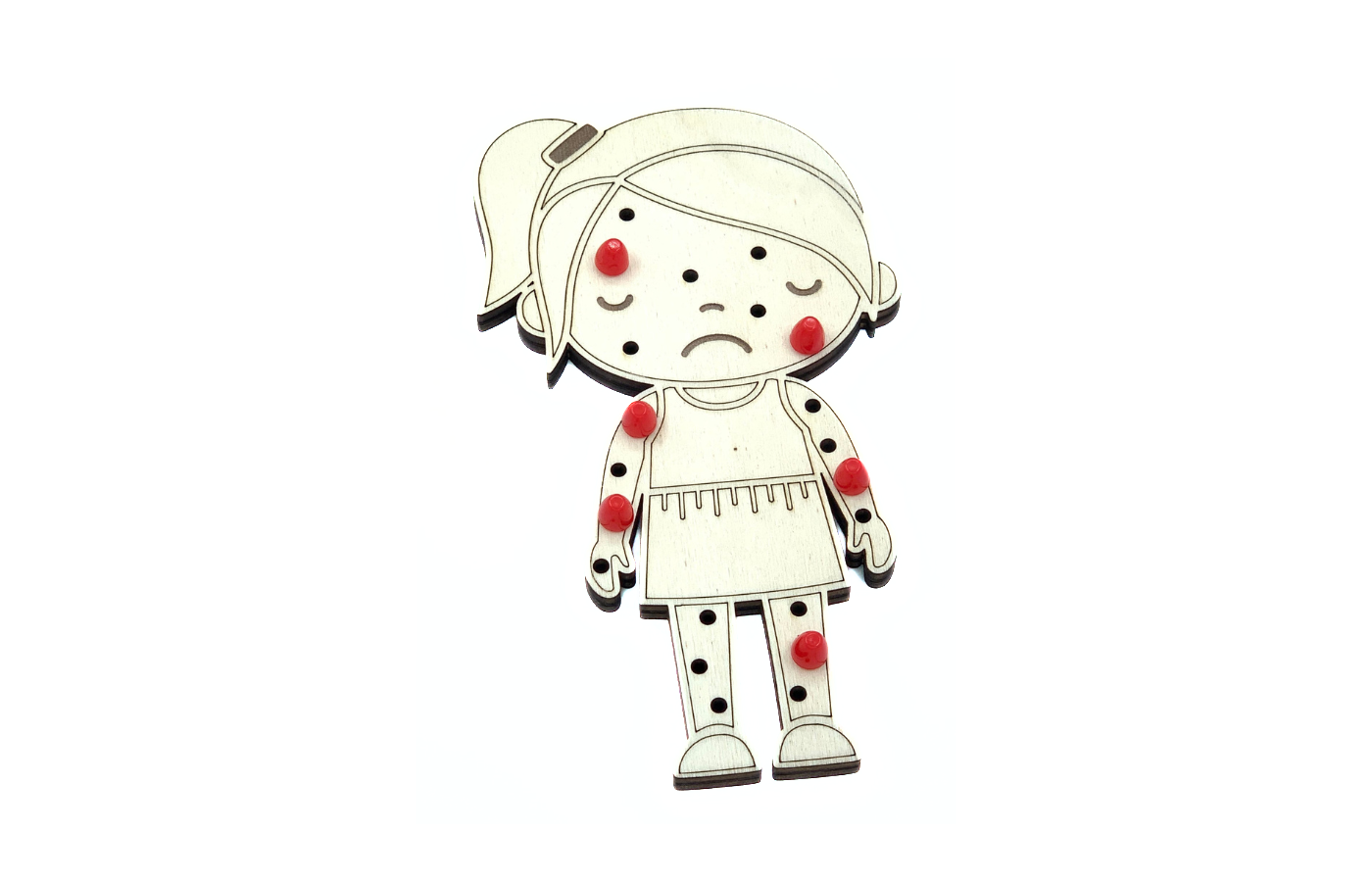 Jeu concernant l'orientation spatiale et la motricité fine. La fille est malade, a mal et est triste. Les enfants rangent les perles (rouges) sur la fille aux endroits où elle a mal.