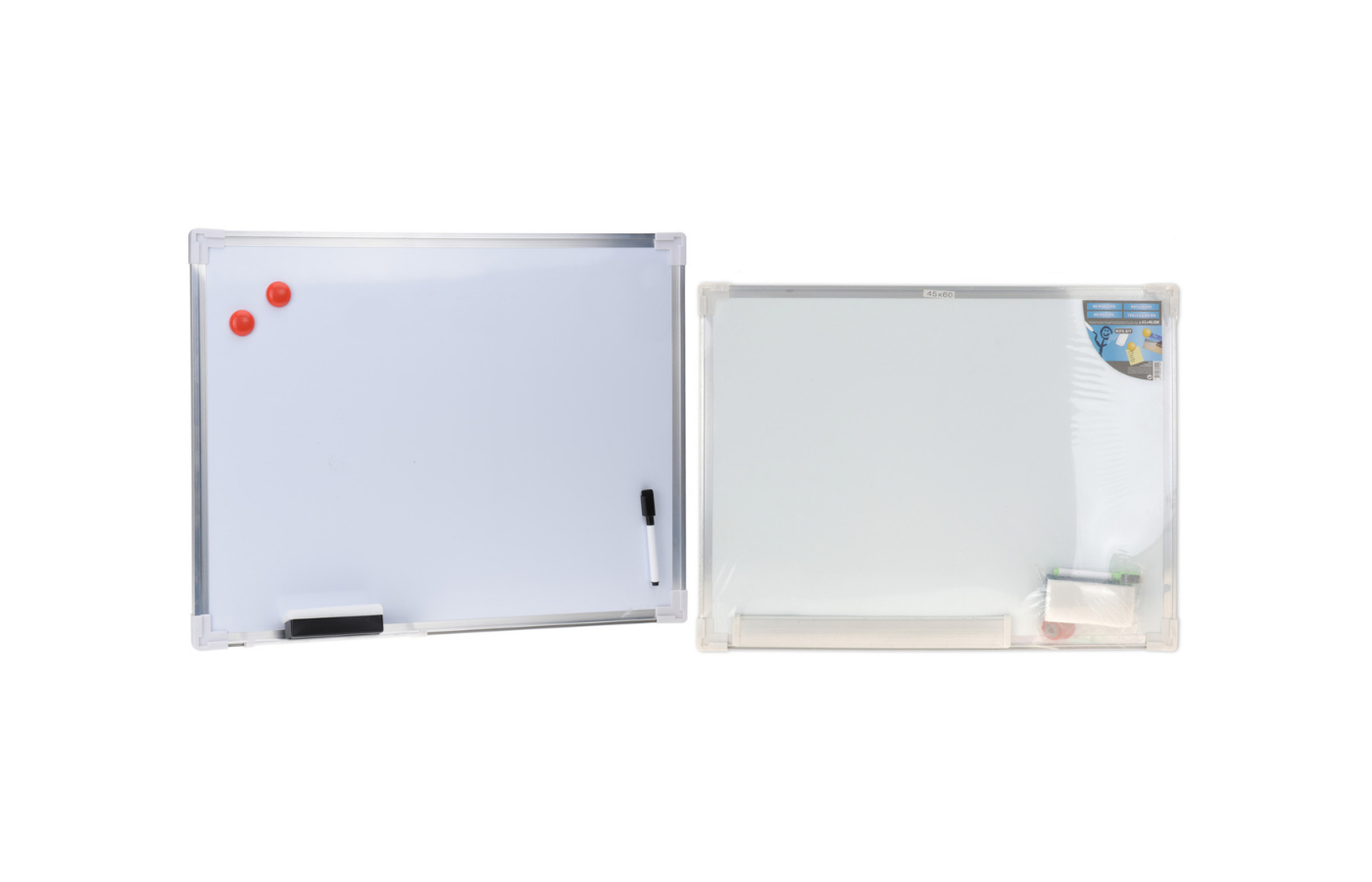 Tableau blanc avec cadre en aluminium. Marqueur effaçable avec gomme, 2 aimants (rouges) et porte-gomme inclus.