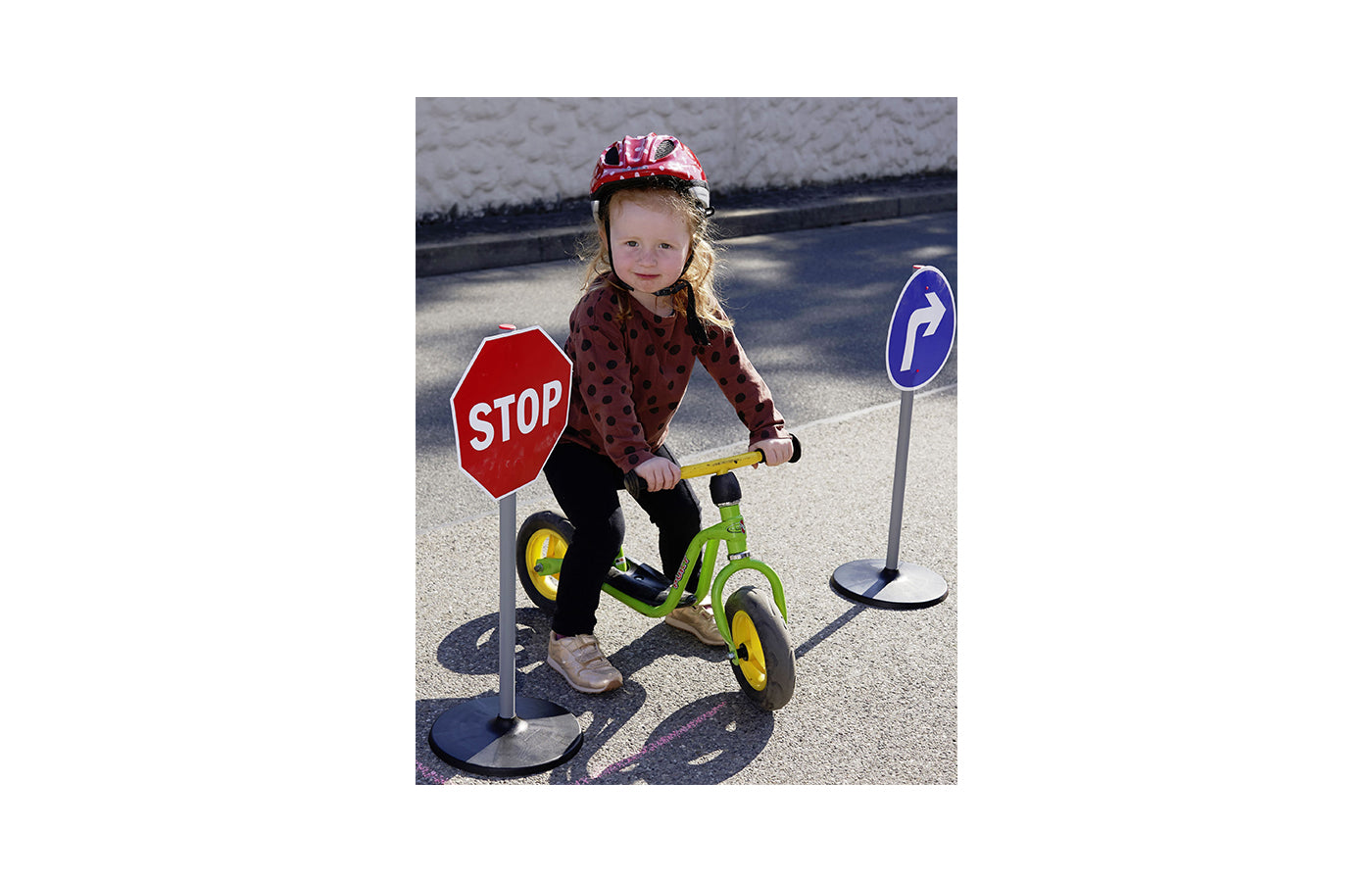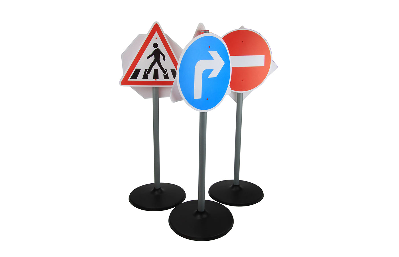 Avec cet ensemble de panneaux de signalisation, les enfants apprennent de manière ludique les premiers panneaux et règles de circulation. L'ensemble se compose de 6 panneaux, 3 supports et 12 clips pour fixer les panneaux aux poteaux. Avec les clips, les panneaux de signalisation peuvent être fixés d'un ou des deux côtés des supports. À combiner avec le feu de circulation et les cônes.